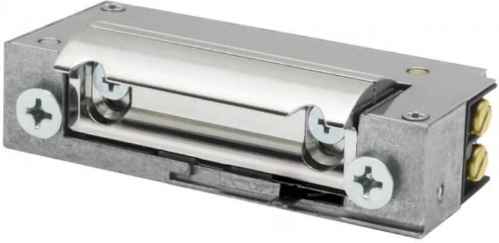 Elektrozaczep BIRA XS00UPWElektrozaczepy z serii XS są wąskie (tylko 16,2 mm szerokości) i mają niewielkie wymiary, umożliwiające montaż w wąskich profilach i ościeżnicach drzwiowych. Zbudowane są symetrycznie – doskonale sprawdzają się w drzwiach lewych i prawych różnego typu. Zaczep posiada możliwość regulacji w zakresie 3,5mm i ma radialny kształt (nie wychodzi poza obrys elektrozamka) - wymaga mniejszego otworowania, co ułatwia i przyspiesza montaż. Model XS00UPW dodatkowy został wyposażony w pamięć oraz wyłącznik. Pamięć w elektrozaczepie sprawia że elektrozaczep po otrzymaniu impulsu elektrycznego utrzymuje stan jednorazowego zwolnienia zaczepu do momentu otwarcia drzwi, furtki itd.. Po zatrzaśnięciu drzwi zaczep wraca do pozycji pierwotnej (zablokowanej). Wyłącznik mechaniczny odłącza elektryczne sterowanie elektrozaczepem, umożliwiając pozostawienie drzwi otwartych niezależnie od impulsów elektrycznych, do czasu ponownego przełączenia wyłącznika. Elektrozaczep z mechanicznym wyłącznikiem często określany jest jako elektrozaczep z funkcją „dzień-noc. Cechy charakterystyczne: typ pracy NC (normalnie zamknięty) lub NO (rewersyjny) symetryczna budowa wymiary: szerokość 16,2mm, wysokość 67mm, głębokość 28mm, wytrzymałość mechaniczna – nacisk 3000N (300kg) wytrzymałość mechaniczna – cykle otwierania 200 000 do drzwi lewych i prawych zaczep regulowany w zakresie 3,5mm radialny kształt zaczepu – podczas otwierania zaczep nie wychodzi poza obrys zamka