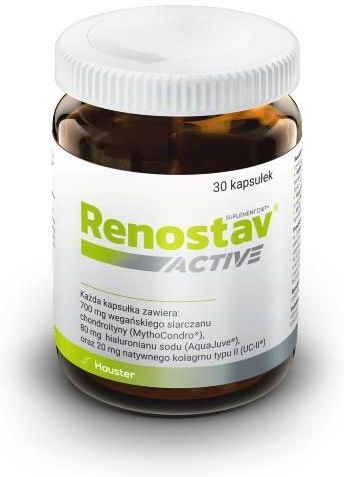 Renostav® Active – zaawansowana formuła wspierająca stawy | 30 kapsułek Renostav® Active to specjalistyczny suplement diety opracowany z myślą o kompleksowym wsparciu zdrowia stawów, chrząstek i mazi stawowej. Bazuje na trzech starannie dobranych składnikach aktywnych, których skuteczność została potwierdzona badaniami klinicznymi. Skład preparatu odpowiada najnowszym zaleceniom towarzystw naukowych zajmujących się zdrowiem układu ruchu. Główne składniki aktywne MythoCondro® – czysty, biologicznie aktywny siarczan chondroityny pozyskiwany metodami biotechnologicznymi. Charakteryzuje się wysoką stabilnością i precyzyjnie określoną strukturą molekularną. AquaJuve® – biodostępna forma kwasu hialuronowego w postaci hialuronianu sodu, pochodzenia naturalnego. Ułatwia regenerację tkanek i utrzymanie odpowiedniego poziomu nawilżenia stawów. UC-II® – natywny kolagen typu II o zachowanej strukturze przestrzennej, który wspomaga integralność i elastyczność chrząstki stawowej. Dlaczego warto wybrać Renostav® Active? Wspomaga regenerację i elastyczność stawów Pomaga utrzymać prawidłową kondycję chrząstki stawowej Zawiera składniki o wysokiej biodostępności i czystości Odpowiedni dla osób aktywnych fizycznie oraz seniorów Nie zawiera zbędnych dodatków technologicznych Składniki aktywne w jednej kapsułce oraz w zalecanej dziennej porcji (3 kapsułki): Siarczan chondroityny (MythoCondro®): 700 mg / 2100 mg Kwas hialuronowy (AquaJuve®): 80 mg / 240 mg Kolagen typu II (UC-II®): 20 mg / 60 mg Zalecane spożycie 1 kapsułka trzy razy dziennie, popijając wodą. Dla kogo przeznaczony jest Renostav® Active? Renostav® Active sprawdzi się u osób odczuwających dolegliwości stawowe, prowadzących aktywny tryb życia, seniorów, a także wszystkich, którzy chcą kompleksowo wspierać układ kostno-stawowy.