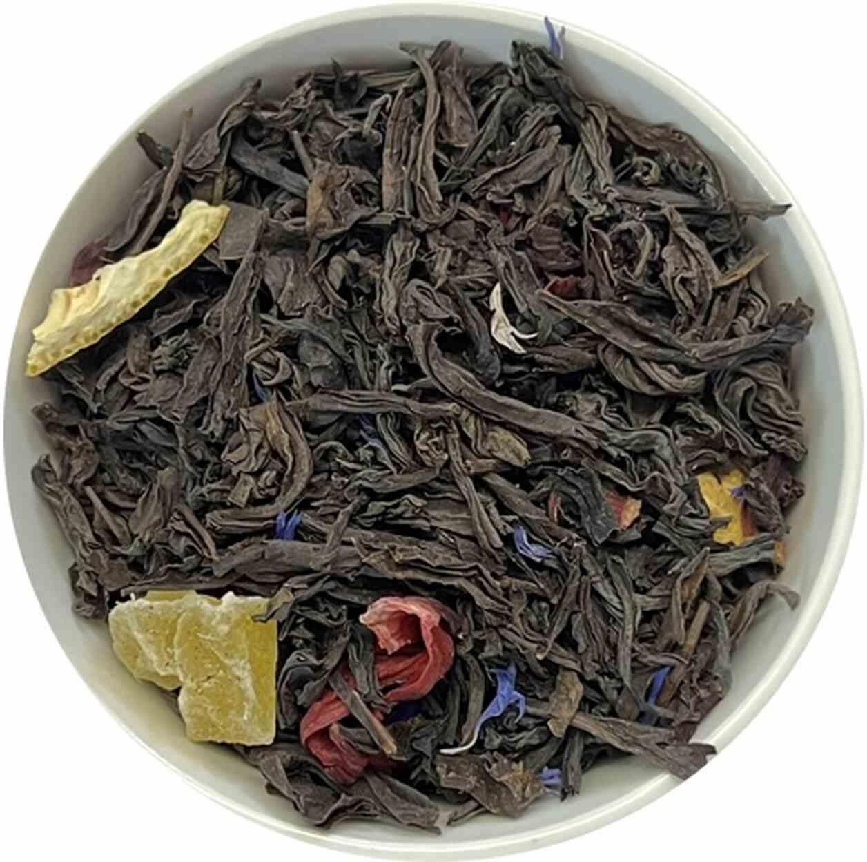 Posiada bogaty i aromatyczny smak z hibiskusem, mango, pomarańczą, papają, bławatkiem, cytryną i czerwoną porzeczką to orzeźwiający napój, który zachwyca intensywnym smakiem owoców i subtelnością herbaty czarnej. Soczyste mango, słodka papaja, cytryna i czerwona porzeczka tworzą harmonijną mieszankę z delikatnymi akcentami kwiatowymi hibiskusa. To prawdziwie aromatyczne doznanie dla miłośników owocowych i orzeźwiających herbat. Składniki: herbata czarna ceylon, hibiskus, mango, pomarańcza, papaja, bławatek, cytryna, czerwona porzeczka, aromat Informacje o alergenach: *Produkt może zawierać zboża zawierające: gluten, seler, gorczycę, nasiona sezamu, orzeszki ziemne oraz orzechy Forma: mieszanka Smak: słodki owocowy Rodzaj: owocowe Waga: 500g