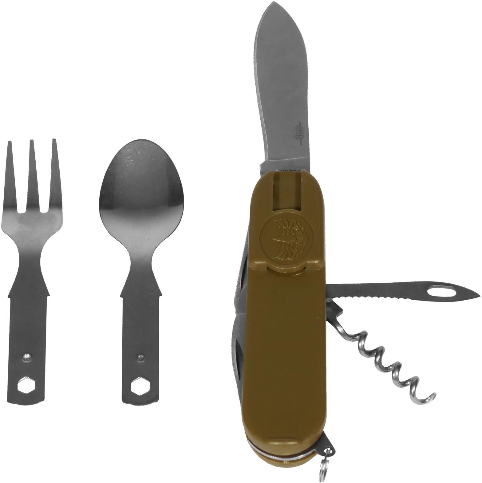 Niezbędnik-scyzoryk turystyczny kempingowy Joker JKR123 9-funkcyjny z pokrowcem Olive Idealny dla poszukiwaczy przygód, miłośników survivalu, podróżników, wędkarzy i myśliwych. Sprawdzi się podczas wypadu w teren oraz na wyprawie survivalowej. Wysokiej jakości niezbędnik turystyczny hiszpańskiej marki JOKER - znanej na całym świecie ze swoich doskonałych wyrobów. Utrzymany w wojskowej stylistyce niezbędnik ten jest praktycznym połączeniem scyzoryka oraz rozłączanych sztućców. Niezbędnik wykonany jest z mocnej stali nierdzewnej, odpornej na korozję, przenoszenie zapachów oraz odkształcenia. Rękojeść wykonana jest z wytrzymałego polimeru w kolorze zielonym - oliwkowym. Zestaw 9 funkcji obejmuje nóż łyżka widelec korkociąg otwieracz do butelek z dużym śrubokrętem płaskim otwieracz do butelek z małym śrubokrętem płaskim otwieracz do puszek z piłką / przebijak / szydło Ostry otwieracz do puszek z dodatkową piłą poradzi sobie z każdą konserwą, nawet z najgrubszej blachy. Każdy ze sztućców posiada oczko umożliwiające przeciągnięcie linki zabezpieczającej przed ich zgubieniem. Dodatkowo niezbędnik wyposażony jest w sprężyste kółko umożliwiające dopięcie go do odzieży lub ekwipunku. W komplecie znajduje się pokrowiec z kordury, z możliwością przypięcia do pasa. Całość zapakowana jest w ładne tekturowe pudełko co sprawia że niezbędnik idealnie nadaje się na prezent. Cechy produktu materiał: stal nierdzewna 420J2 materiał rękojeści: tworzywo sztuczne materiał pokrowca: cordura ilość funkcji: 9 otwieranie: manualne ostrze: gładkie długość głównego ostrza: 80 mm grubość głowni: 2 mm długość po złożeniu: 10,5 cm długość całkowita: 16 cm producent (marka): Joker, Hiszpania kod produktu: 060-013