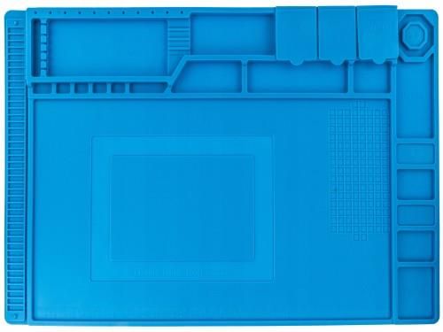 MATA SILIKONOWA DO LUTOWANIA IZOLACYJNA Z ORGANIZEREM SERWISOWA 450X300MM ⬇️OPIS PRODUKTU: ⭐Profesjonalna mata silikonowa przeznaczona jest do serwisów urządzeń elektronicznych, GSM, foto. Służy do segregacji i unieruchomienia części i elementów elektronicznych, wszelkich elementów metalowych i śrubek podczas naprawy smartfonów, tabletów, laptopów itp. Wykonana jest z silikonu odpornego na temperatury 500°C. Dzięki temu prace lutownicze można wykonywać bezpośrednio na płytce PCB umieszczonej na macie. Antypoślizgowe właściwości silikonu pomagają podczas lutowania ponieważ przedmioty nie przesuwają się. Posiada przegródki w których można umieścić elektronarzędzia, większe elementy elektroniczne a także śrubki w sposób zorganizowany tj. np. wg. kolejności montażu i demontażu. Mata została wyposażona w linijkę o długości 36cm oraz segregator posiadający łącznie 189 przegródek. ⬇️DANE TECHNICZNE: ✅23 przegródek na większe elementy, ✅Wysokość: 300mm ✅Szerokość: 450mm ✅Grubość: 3-4mm ✅Ilość przegródek całkowita: 189 ✅Odporność temperaturowa: do 500°c ✅Kolor: niebieski ✅Linijka o długości 36cm