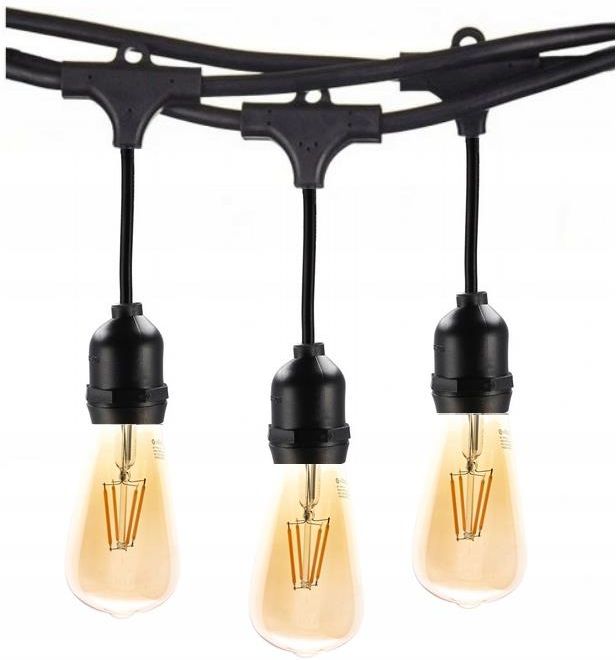 Girlanda Ogrodowa 10m+LED 4W ST64 AMBER E27 6,4cm Milagro Girlanda Ogrodowa + Żarówki LED Długość: 10 m Ilość żarówek: 10 szt.(szkło bursztynowe) Gwint: E27 Moc żarówki: LED 4W (400 Lm) Barwa światła: ciepła Wymiary Żarówki: ⌀6,4 Wys. 14,3cm Zasilanie: 230V Możliwość łączenia: TAK IP: IP44 Długość girlandy: 10 m Odstępy pomiędzy gniazdami: 95 cm Zastosowanie: girlandy ogrodowe, pozwalają stworzyć nastrój w ogrodzie, na tarasie, na werandzie, delikatne ciepłe światło sprawia, iż miejsce z pozoru typowe staje się fantastycznym miejscem relaksu i odpoczynku. Technologia LED: girlandy wykonane zostały w taki sposób, iż można z powodzeniem stosować do nich nowoczesne żarówki LED, w zestawie girlanda zawiera 10 szt żarówek LED o barwie ciepłej światła. Prosty montaż: girlandy przygotowane zostały tak, aby można było je z łatwością zainstalować, gniazda E27 w które wkręcane są żarówki, posiadają uchwyty mocujące, wiązka natomiast zakończona jest gniazdem umożliwiającym podłączenie kolejnego odcinka girlandy. Na zewnątrz oraz do wnętrza: dzięki precyzyjnemu wykonaniu girlandy z powodzeniem nadają się do ich instalacji również na dworze, na zewnątrz. Stan: Nowy EAN: 5906593701742 Kod producenta: 1916 Marka: Milagro Liczba punktów światła: Do 10 Długość: 1000 Średnica kuli: 6 Gama kolorystyczna: czarny Zasilanie: sieciowe Klasa efektywności energetycznej: A Zastosowanie: na zewnątrz Odległość między żarówkami: 95