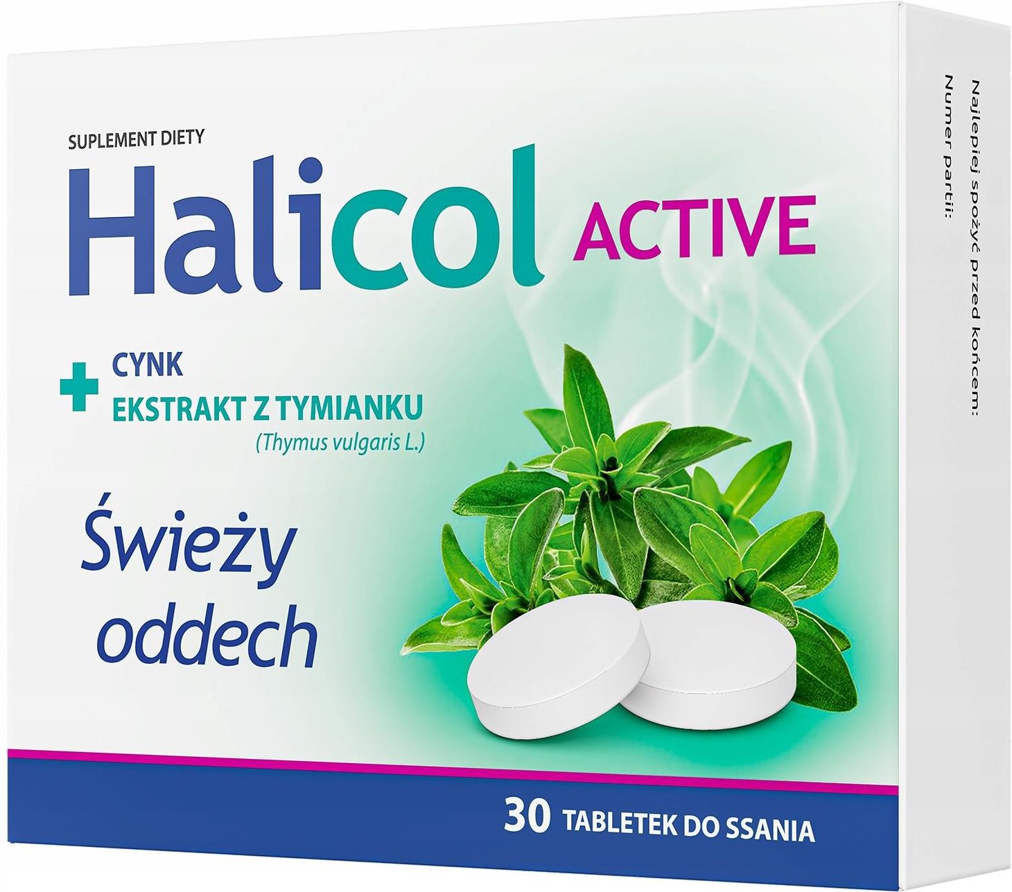 Nature Pharm Halicol Active 30 tabletek do ssania na świeży oddech Opis Nature Pharm, Halicol Active to suplement diety zawierający składniki wspomagające świeży oddech. Produkt przeznaczony dla osób dorosłych. Składniki Substancja wypełniająca: sorbitole; cynk (glukonian cynku); substancje słodzące: acesulfam K, sukraloza; substancja przeciwzbrylająca: sole magnezowe kwasów tłuszczowych; ekstrakt z ziela tymianku pospolitego (Thymus vulgaris L.). Składnik 1 tabletka %RWS* 3 tabletki %RWS* Mentol 6 mg - 18 mg - Cynk (glukonian cynku) 5 mg 50% 15 mg 150% Ekstrakt z ziela tymianku pospolitego (Thymus vulgaris L.) DER 10:1 1 mg - 3 mg - *RWS - Referencyjna Wartość Spożycia Masa netto 15,45 g Właściwości składników Nature Pharm, Halicol Active to suplement diety zawierający: Cynk, który pomaga utrzymać prawidłową równowagę kwasowo-zasadową. Ekstrakt z ziela tymianku, który wspiera utrzymanie świeżego oddechu oraz wpływa kojąco na gardło. Zalecane dzienne spożycie Dorośli: 1 tabletka 3 razy dziennie. Po zastosowaniu należy powstrzymać się od jedzenie i picia przez 30 minut. Ostrzeżenia dotyczące bezpieczeństwa Nie należy przekraczać zalecanej dziennej porcji. Suplement diety nie może być stosowany jako substytut (zamiennik) zróżnicowanej diety. Suplement diety jest środkiem spożywczym, którego celem jest uzupełnienie normalnej diety. Dla utrzymania prawidłowego stanu zdrowia należy stosować zróżnicowaną dietę i prowadzić zdrowy tryb życia. Przechowywać w temperaturze pokojowej. Przechowywać w sposób niedostępny dla małych dzieci. Zawiera źródło fenyloalaniny. Nie stosować u osób chorych na fenyloketonurię. Nie stosować w przypadku nadwrażliwości na którykolwiek ze składników. Spożycie w nadmiernych ilościach może mieć działanie przeczyszczające.
