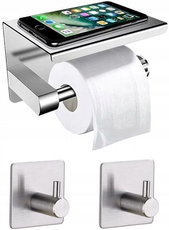 Łazienkowy uchwyt na papier toaletowy z półką. W zestawie znajdują się również dwa haczyki łazienkowe. Charakterystyka Na półce z łatwością położysz smartfona o dużych rozmiarach, może być używana również jako miejsce na dyfuzor lub inne akcesoria. Łatwa instalacja — do montażu przy użyciu taśmy samoprzylepnej. Bez konieczności wiercenia, jednak jeśli chcesz zamontować go do ściany za pomocą wkrętów, są one dołączone do zestawu. Haczyki świetnie sprawdzą się w kuchni, łazience, biurze czy przedpokoju. Doskonałe do zawieszania ręczników, akcesoriów kuchennych, ubrań, kluczy itp. Montaż wieszaków jest niezwykle prosty i nieinwazyjny. Po oczyszczeniu i osuszeniu powierzchni, wystarczy odkleić folię ochronną, przykleić wieszak i poczekać na utrwalenie przez 24 godziny. W zestawie znajduje się Uchwyt na papier toaletowy 2 x haczyki łazienkowe Specyfikacja Materiał: stal nierdzewna Kolor: srebrny Wymiary uchwytu: 14,5 (szer.) x 10 (gł.) x 10 (wys.) cm Wymiary haczyka: 4,5 (szer.) x 3 (gł.) x 4,5 (wys.) cm Wymiary opakowania: 16 (szer.) x 11 (gł.) x 11 (wys.) cm Sposób montażu Oczyść i osusz powierzchnie, do której chcesz przymocować uchwyt Odklej folię zabezpieczającą taśmę Mocno dociśnij uchwyt do przyklejanej powierzchni Odczekaj 24h od montażu nr katalogowy: CH-235455