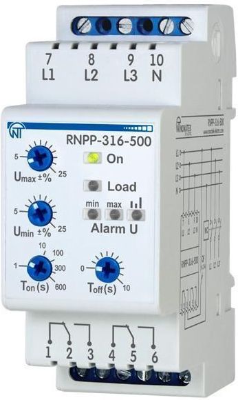 RNPP-316-500 przeznaczony jest do pomiaru skutecznej wartości napięcia liniowego sieci trójfazowej. Znamionowe napięcie liniowe – 500V. Przekaźnik kontroli napięcia, symetrii oraz kolejności faz pełni funkcje: Odłączenie obciążenia w przypadku nieprawidłowego napięcia sieciowego Kontrola dopuszczalnych wartości napięcia Kontrola kolejności faz Kontrola obecności wszystkich faz oraz symetrii napięcia sieciowego Kontrola jakości napięcia sieciowego po odłączeniu obciążenia oraz jego automatycznym ponownym załączeniu po uprzednim przywróceniu właściwych parametrów napięcia sieci Sygnalizacja awarii Urządzenie przewiduje możliwości regulacji parametrów: Progu zadziałania przy zmianie napięcia z odrębnymi regulacjami nastaw minimalnego/maksymalnego napięcia Czasu SPZ Czasu opóźnienia zadziałania zabezpieczenia Ponowne uruchomienie obciążenia z określonym czasem SPZ następuje po uprzednim przywróceniu właściwych parametrów sieci.