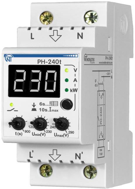 Przekaźnik napięciowy PH-240T jest przeznaczony do ochrony sprzętu domowego i przemysłowego, takich jak lodówki, klimatyzatory, pralki, urządzenia telewizyjne, wideo i audio itp., przed niedopuszczalnymi wahaniami napięcia w sieci oraz skutkami przerwania przewodu neutralnego (zera). Urządzenie jest przeznaczone na prąd obciążenia do 40 A. Wyświetla aktualną wartość napięcia w sieci oraz stan kontaktów wyjściowych (stan obciążenia). Posiada ochronę przed przegrzaniem z powodu przekroczenia nominalnego prądu obciążenia. Mierzy i wyświetla na wyświetlaczu prąd pobierany przez obciążenie, moc czynną i bierną oraz odłącza obciążenie, gdy przekroczone zostaną zadane progi prądu i mocy. PH-240T może być używany jako przekaźnik napięcia przekaźnik ograniczenia pobieranej mocy cyfrowy multimetr (wyświetlanie napięcia sieci, mocy całkowitej, czynnej, biernej oraz pobieranego prądu) Dane techniczne Rozmiar: 2 DIN (36 mm) Maksymalna moc pomiarowa: 11 kW Prąd pomiaru: 63 А Maksymalny prąd przełączania: 40 А Liczba faz: 1 Sposób montażu: do rozdzielnicy (na szynę DIN) Nominalne napięcie robocze: 230/240 АC Maksymalne obciążenie prądowe: 40 А Maksymalna moc obciążenia: 9 kW Parametry kontrolowane: napięcie, natężenie prądu, moc Dodatkowe funkcje: ochrona termiczna, zabezpieczenie napięciowe Sposób sterowania: pokrętła (regulatory) Indykacja: tak