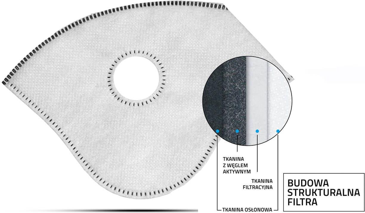MASKA SPORT – DEDYKOWANY FILTR N99 Filtr przeznaczony do masek typu SPORT. Ścięcie widoczne z prawej strony należy umieścić u nasady filtra czyli w części nosowej maski. FILTR 99 Pięcio-warstwowy filtr z węglem aktywowanym (Activated carbon) N99 zatrzymuje 99% szkodliwych zanieczyszczeń w postaci pyłów PM10 i PM2.5, spalin, dwutlenku siarki SO2, dwutlenku azotu NO2, ozonu O3, metali ciężkich, dioksyn, węglowodorów rakotwórczych w tym benzo-a-piernu, dymów także papierosowych, przykrych zapachów, alergenów, pyłków, kurzu, pleśni, virusów i bakterii. Warstwa wykonana z włókniny zatrzymuje kurz, roztocza i alergeny. Warstwa to flanela poliestrowa z nano-włóknami stanowiąca barierę dla pyłów o średnicy większej od 10 µm. Warstwa to węgiel aktywowany– najważniejsza broń filtra, którego porowata budowa i siła grawitacyjna Van der Waalsa przyciąga i zatrzymuje molekuły otaczających gazów i cieczy o średnicy większej od 2,5 µm. Warstwa wykonana jedwabnej watoliny pełni rolę bariery termicznej. Warstwę tworzy delikatna, oddychająca i pochłaniająca wilgoć flanela bawełniana. Czas pracy filtra zależy od stężenia zanieczyszczeń i waha się od 24 do 48 godzin. UWAGA filtr N99 nie jest filtrem HEPA, gdyż takie filtry usuwają jedynie zanieczyszczenia fizyczne. Zanieczyszczenia chemiczne są w stanie zatrzymać jedynie filtry z węglem aktywowany takie jak zastosowany w maskach ACTIVE i SPORT filtr N99. WYMIANA FILTRA | Rozchyl wewnętrzną stronę maski. Zobaczysz zaworki, które są charakterystycznymi okrągłymi pierścieniami z napisami OPEN i strzałką obrotu niezgodną z obrotem wskazówek zegara oraz CLOSE i strzałką obrotu zgodną z obrotem wskazówek zegara. Kierunek strzałki dla OPEN odpowiada odkręcaniu zaworów. Kierunek strzałki dla CLOSE odpowiada zakręcaniu zaworów. Po odkręceniu każdy z zaworów dzieli się na dwie części. Wszystkie części odkładamy w bezpieczne i czyste miejsce. Następnie zapamiętujemy ułożenie filtra i usuwamy go z maski. Na jego miejsce wkładamy nowy filtr, który układamy w masce w ten sposób aby nałożyły się otwory maski i filtra. W otwory wkładamy najpierw wewnętrzną część filtra tak aby przeszła przez oba. Następnie nakładamy zewnętrzną cześć filtra i po z licowaniu przekręcamy w prawo czyli zgodnie z ruchami wskazówek zegara, aż do charakterystycznego kliknięcia. ZAWORY | Zawory membranowe otwieramy w sposób opisany w procedurze wymiany filtra. Następnie sprawdzamy czy w obu częściach a w szczególności pod membraną nie znajdują się ciała obce i zanieczyszczenia. Po usunięciu zanieczyszczeń płuczemy obie części zaworka pod silnym strumieniem letniej bieżącej wody. Wszystkie części odkładamy na uprzedni przygotowaną czysta ściereczkę lub ręcznik. Po wyschnięciu zaworki montujemy zgodnie z opisem z procedury wymiany filtra. CERTYFIKATY PFE – Efektywność filtracji cząstek BFE – Efektywność filtracji bakterii VFE – Efektywność filtracji wirusów CE – Certyfiat Nr IT031229AD17041