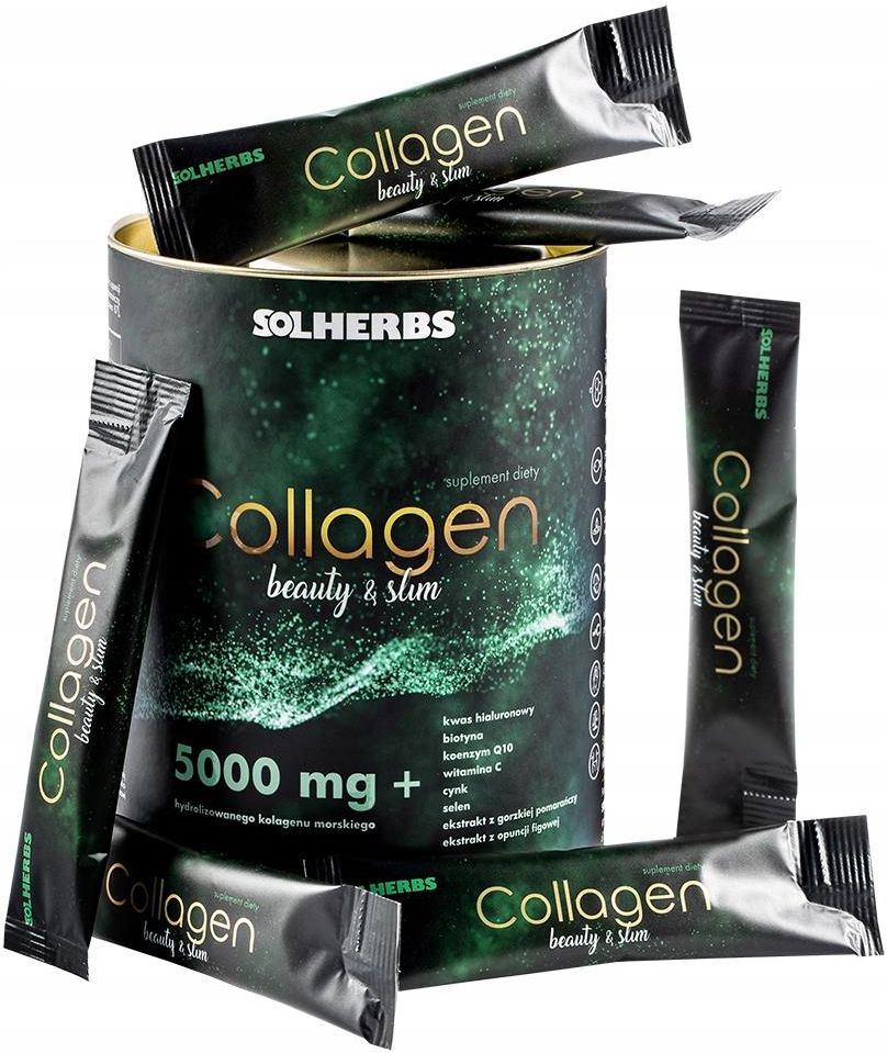 SOLHERBS Collagen Beauty & Slim Kolagen Morski 5000mg 30 saszetki Suplement diety Kolagen Beauty & Slim SOLHERBS powstał by dostarczyć od wewnątrz skórze, włosom i paznokciom kluczowych witamin i składników odżywczych. A dodatkowo by wspierać starania o wymarzoną sylwetkę! Kolagen SOLHERBS to 5000 mg hydrolizowanego kolagenu rybiego, wzbogaconego o kwas hialuronowy, koenzym Q10, biotynę, witaminę C, cynk i selen. Naturalny skład bez wypełniaczy i konserwantów! Nie zawiera cukru! Przyjemny owocowy smak (bez rybiego posmaku)! Kolagen Beauty & Slim SOLHERBS...by zatrzymać urodę na dłużej Suplement diety Kolagen Beauty & Slim SOLHERBS powstał by dostarczyć od wewnątrz skórze, włosom i paznokciom kluczowych witamin i składników odżywczych. A dodatkowo by wspierać starania o wymarzoną sylwetkę! Kolagen SOLHERBS to 5000 mg hydrolizowanego kolagenu rybiego, wzbogaconego o kwas hialuronowy, koenzym Q10, biotynę, witaminę C, cynk i selen w formie wygodnych saszetek Kolagen Beauty & Slim SOLHERBS to czysty skład bez wypełniaczy i konserwantów. Produkt nie zawiera cukru. Ekstrakt z owocu gorzkiej pomarańczy zawierający synefrynę oraz ekstrakt z opuncji figowej wspierają kontrolę wagi i pomagają w utrzymaniu zdrowego poziomu tkanki tłuszczowej. Kolagen Kolagen jest substancją naturalnie produkowana przez organizm, który jest głównym składnikiem strukturalnym skóry (głównie skóry właściwej) - stanowią około 80% suchej masy skóry. Kolagen wpływa głównie na zdolność wiązania wody przez skórę a także na jej elastyczność i wygląd zewnętrzny (zmarszczki). Stanowi budulec m.in. tkanki łącznej, stawów, chrząstki i ścięgien. Utrata kolagenu zaczyna się już w wieku około 25 lat. Szacuje się, że około 70 roku życia synteza kolagenu zupełnie zanika, dlatego kolagen nazywany jest "białkiem młodości". Skład kolagenu SOLHERBS oparty jest o najwyżej jakości hydrolizat białek kolagenowych, o niskiej masie peptydów, pozyskiwany z wyselekcjonowanych gatunków ryb. Określenie hydrolizowany oznacza, że białko kolagenu poddane zostało procesowi hydrolizy, dzięki czemu cząsteczki kolagenu rozłożone zostały na mniejsze peptydy kolagenowe, które są łatwiejsze do wchłonięcia w jelitach. Peptydy kolagenowe zużyte zostaną przez organizm do produkcji własnego kolagenu (m.in w skórze i stawach). Uważa się, że kolagen morski (pozyskiwany z ryb) jest najbardziej zbliżony budową do kolagenu ludzkiego i uznawany jest za lepszy od kolagenu wołowego i wieprzowego. 55% peptydów to aminokwasy glicyna i prolina. Badania konsumenckie prowadzone przez producentów kolagenu wskazują wiele obiecujących rezultatów w zakresie: poprawy wyglądu zmarszczek (ich redukcji), uelastycznienia skóry, poprawy napięcia skóry (redukcji cellulitu) , zmniejszenie łamliwości paznokci , poprawy struktury włosów. Zaobserwowane przez konsumentki pozytywne efekty związane były z regularnym i systematycznym stosowaniem kolagenu. Kwas hialuronowy i Koenzym Q10 Kwas hialuronowy wiąże wodę w skórze właściwej. W skórze ludzkiej kwas hialuronowy jest składnikiem macierzy międzykomórkowej skóry właściwej. W młodej skórze kwasu hialuronowego jest pod dostatkiem, co gwarantuje jej sprężystość, elastyczność i brak zmarszczek. Wraz z wiekiem ilość kwasu hialuronowego maleje. Kwas hialuronowy jest również głównym składnikiem mazi stawowej. Jest odpowiedzialny za lepkość mazi, smarowanie powierzchni stawowych, rozprowadzanie substancji odżywczych i odżywianie chrząstki. Znajduje się on również w ciele szklistym oka. Koezym Q10 inaczej ubichinon. Jego główną właściwością jest zapewnienie odpowiedniego wytwarzania energii w mitochondrium każdej komórki. Podobnie jak w przypadku kwasu hialuronowego, produkcja koenzymu Q10 w organizmie zmniejsza się wraz z wiekiem. Jest powszechną substancją aktywną, stosowaną w kosmetykach, których zadaniem jest niwelowanie oznak starzenia, zwalczanie pogłębianie się zmarszczek, a także spłycanie niewielkich wgłębień na skórze. Produkty zawierające koenzym Q10 przeznaczone są dla osób które chcą skutecznie ochronić swój organizm przed szkodliwym wpływem wolnych rodników, odpowiedzialnych m.in. za procesy starzenia. Witaminy i mikroelementy Witamina C pomaga w prawidłowej produkcji kolagenu w celu zapewnienia prawidłowego funkcjonowania naczyń krwionośnych, kości, chrząstki, dziąseł, skóry i zębów. A także przyczynia się do utrzymania prawidłowego metabolizmu energetycznego i pomaga w ochronie komórek przed stresem oksydacyjnym. Biotyna jest inaczej nazywana witaminą B7 lub H7. Należy do witamin z grupy B i jest rozpuszczalna w wodzie. Biotyna pomaga zachować zdrowe włosy, skórę i paznokcie, pomaga w utrzymaniu prawidłowego stanu błon śluzowych, przyczynia się do prawidłowego metabolizmu makroskładników odżywczych. Cynk i selen są niezbędne do prawidłowego funkcjonowania organizmu. Cynku i selen pomagają zachować zdrowe włosy, skórę i paznokcie. Cynk pomaga w utrzymaniu prawidłowego metabolizmu węglowodanów i przyczynia się do utrzymania prawidłowego metabolizmu kwasów tłuszczowych. Zrealizuj marzenia o wymarzonej sylwetce Kolagen Beauty & Slim SOLHERBS wzbogacony został o ekstrakt z opuncji figowej oraz ekstrakt z owoców gorzkiej pomarańczy, które wspierają kontrolę wagi. Synefryna zawarta w ekstrakcie z owoców gorzkiej pomarańczy przyczynia się do kontroli masy ciała oraz pomaga w utrzymaniu zdrowego poziomu tkanki tłuszczowej. Synefryna jest substancją należącą do termogeników, pozyskuje się ją z owoców gorzkiej pomarańczy. Występuje ona także naturalnie w innych owocach cytrusowych. Wykorzystywana jest ona w suplementach diety przyśpieszających spalanie tkanki tłuszczowej. Uważać z jej stosowaniem powinny osoby mające dolegliwości związane z układem krążenia oraz osoby st
