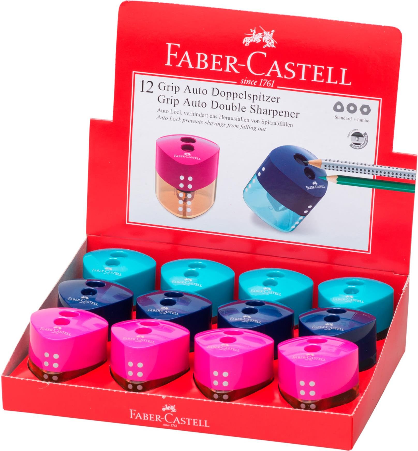 Temperówka podwójna Auto Grip Mini Faber-Castell w kolorach różowo-pomarańczowym, turkusowo-jasnozielonym i niebiesko-błękitnym z pojemnikiem na ostrużyny. Idealna do szkoły i biura. Przeznaczona do klasycznych i trójkątnych kredek i ołówków w standardowym rozmiarze i Jumbo. Z charakterystyczną strefą Grip z małymi punktami i o ergonomicznym trójkątnym kształcie. Wyposażona w specjalny mechanizm, który uniemożliwia wysypywanie się ostrużyn. Ze śrubką zabezpieczającą.Uwaga! Wysyłamy kolor losowy!