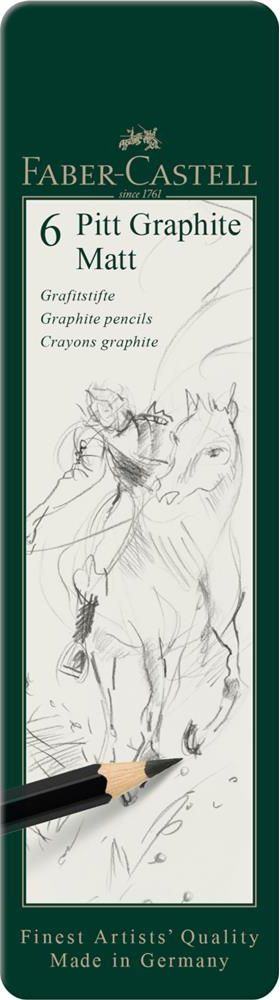 Zestaw ołówków grafitowych Pitt Graphite Matt Faber-Castell o unikalnym matowym wykończeniu 6 szt. w opakowaniu metalowym. To rewolucja w rysunku grafitowym! Specjalnie opracowane, aby zredukować odbicia światła na papierze i stworzyć efekt maksymalnej głębi, dzięki różnym stopniom twardości. To niezwykle matowe, najwyższej jakości grafitowe ołówki dla artystów. Ultra-matowe grafitowe wykończenie dla zmniejszenia odbicia światła na papierze. Najwyższej jakości wartość tonalna dla uzyskania maksymalnego efektu głębi. Miękka i gładka aplikacja. Idealne do pisania, rysowania i szkicowania. Szczególnie nadają się do monochromatycznych prac grafitowych. Klasyczny i ergonomiczny sześciokątny kształt dla komfortu użytkowania. Doskonale odporne na pękanie grafity o stopniu twardości 2B, 4B, 6B, 8B, 10B i 12B. Wykonane z certyfikowanego drewna pochodzącego ze zrównoważonego i odpowiedzialnie zarządzanego leśnictwa. Powierzchnie pokryte lakierem na bazie wody – bezpiecznym dla środowiska i zdrowia. Produkcja neutralna pod względem emisji dwutlenku węgla.