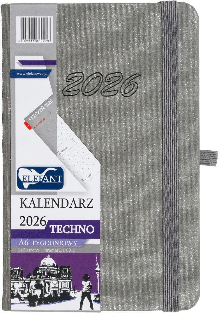 Cechy produktu: Techno: kalendarz książkowy 2026 format: A6 oprawa twarda: nowa oprawa imitująca drobinki kryształków, mieniąca się w świetle kolor: szary zamykany na gumkę w kolorze szarym gumka na długopis w kolorze szarym brzegi kalendarza z kolekcji Techno są w kolorze kremowym zaokrąglone narożniki opraw i stron tasiemka w kolorze szarym koperta na odwrocie oprawy w kolorze kremowym układ: tygodniowy – przejrzysty i jasny rozkład kalendarza Techno liczba stron: 146 strony gramatura papieru: 80 g/m2 papier w kolorze delikatnym chamois wewnątrz: plan roku i rozkład roku 2026, terminy ferii zimowych, święta oficjalne i zwyczajowe, protokół powypadkowy w przypadku stłuczki, notes, skorowidz teleadresowy, kalendarium dodatkowe na 2025-2026-2027 rok wymiary: długość 140 mm, szerokość 92 mm, wysokość 15 mm oprawa przygotowana do personalizacji kalendarza np. logo firmy, imię i nazwisko itp.