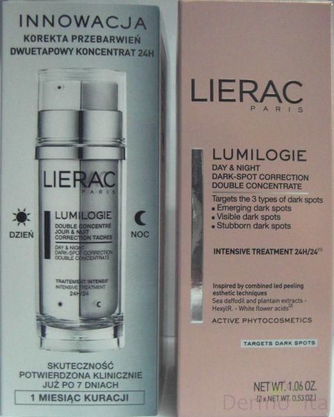 LIERAC LUMILOGIE Dwuetapowy koncentrat na dzień i na noc korygujący przebarwieniaWskazania:Lierac Lumilogie Dwuetapowy koncentrat na dzień i na noc korygujący przebarwienia to kosmetyk do codziennej pielęgnacji skóry twarzy, szczególnie z widocznymi przebarwieniami.Właściwości:Lierac Lumilogie Dwuetapowy koncentrat na dzień i na noc korygujący przebarwienia to innowacyjne rozwiązanie dla osób, które borykają się ze szpecącymi przebarwieniami – Lierac Lumilogie dwuetapowy koncentrat korygujący przebarwienia. W jednej buteleczce znajdują się dwa dozowniki z kosmetykami – jeden na dzień, drugi na noc. To dwa kosmetyki w jednej buteleczce. Pierwszy dozownik to koncentrat na dzień, drugi to koncentrat na noc. Stosowane regularnie już po tygodni dają widoczne rezultaty! Efekty w postaci skorygowanych dopiero powstających przebarwień, zredukowanych widocznych przebarwień oraz zmniejszonych przebarwień uporczywych. Koncentrat na dzień ma konsystencję lekkiego fluidu, który tuż po nałożeniu daje efekt optycznego zmniejszenia przebarwień. Koncentrat na noc to delikatny balsam o działaniu wygładzającym. Oba preparaty łączy przyjemność stosowania i szybkie wchłanianie. Dużym atutem jest subtelny zapach białego piżma i magnolii.Skład:Koncentrat na dzień: Aqua (Water Eau), Isodecyl Neopentanoate, Diethylamino Hydroxybenzoyl Hexyl Benzoate, Squalane, Glycerin, Niacinamide, Cetearyl Alcohol, Phenylbenzimidazole Sulfonic Acid, Sodium Stearoyl Glutamate, Alcohol Denat, Caprylic/Capric Triglyceride, Plantago Lanceolata Leaf Extract, Pancratium Maritimum Extract, Ammonium Acryloyldimethyltaurate VP Copolymer, Tromethamine, Ethyl Linoleate, Hexyl Resorcinol, Microcristalline Cellulose, Propylene Glycol, Citric Acid, Xanthan Gum, Silica, Cellulose Gum, Tetrasodium Glutamate Diacetate, Tocopherol, Sodium Hydroxide, Phenoxyethanol, CI 77891 (Titanium Dioxide), CI 77019 (Mica), CI 15985 (Yellow 6), CI 14700 (Red 4), Parfum (Fragrance).Koncentrat na noc: Aqua (Water Eau), Cyclopentasiloxane, Dimethicone, Cyclohexasiloxane, Glycerin, Niacinamide, Ammonium Acryloyldimethyltaurate/VP Copolymer, Dimethicone Crosspolymer, Caprylic/Capric Triglyceride, Plantago Lanceolata Leaf Extract, Faex Extract/Yeast Extract/Extrait de Levure, Pancratium Maritimum Extract, Salicylic Acid, Sodium PCA, Lactic Acid, Malic Acid, Glycolic Acid, Hibiscus Sabdarriffa Flower Extract, Pyruvic Acid, Tartaric Acid, Hexyl Resorcinol, Sodium Lactate, Citric Acid, Tetrasodium Glutamate Diacetate, Tocopherol, Propylene Glycol, Ethylhexylglycerin, Xanthan Gum, Sodium Hydroxide, Phenoxyethanol, CI 15985, Yellow 6, CI 14700 (Red 4), Parfum (Fragrance).Stosowanie:Sposób użycia Lierac Lumilogie Dwuetapowy koncentrat na dzień i na noc korygujący przebarwienia: Koncentrat na dzień: aplikować na oczyszczonej skórze twarzy każdego ranka. Można stosować samodzielnie lub w połączeniu z ulubionym kremem na dzień. Koncentrat na noc: po demakijażu i oczyszczeniu skóry rozprowadzić niewielką ilość preparatu na twarzy. Stosować jako samodzielny kosmetyk lub jako bazę pod wybrany krem na noc. Zaleca się unikać kontaktu z oczami, dlatego podczas aplikacji należy omijać okolice oczu.Opakowanie:30 ml