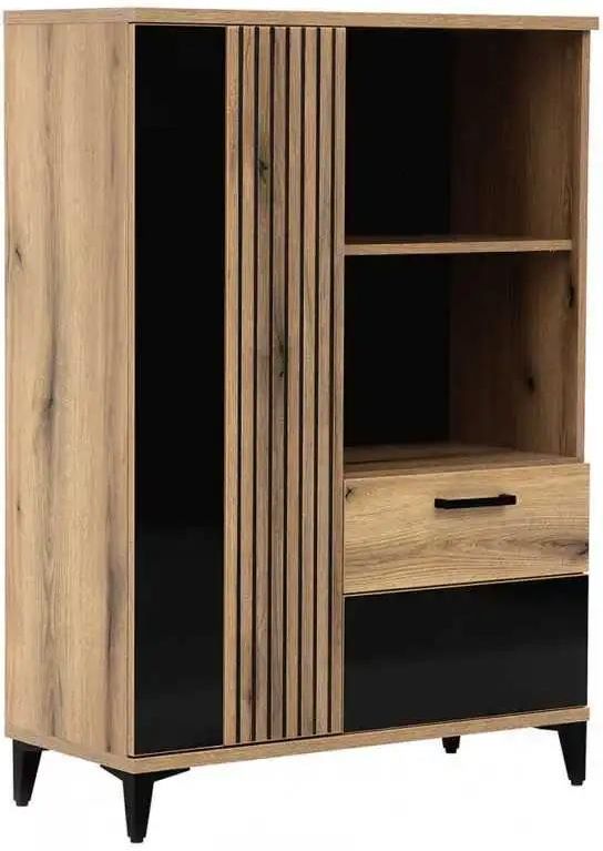Szafka ARIS Połączenie kolorystyki dębu evoke z czernią sprawia, że meble te doskonale sprawdzą się w nowoczesnych wnętrzach. Kolekcja ARIS wyróżnia się prostymi czarnymi uchwytami oraz nóżkami o ciekawym kształcie, co nadaje jej lekkości i wyrazistości. Oprócz nietuzinkowego wyglądu cechuje się również ilością brył, dzięki czemu uzupełni aranżację większości pomieszczeń np. salonu, sypialni. Wymiary Szerokość: 88,5 cm Wysokość: 126 cm Głębokość: 39 cm Dostępny kolor Dąb evoke + Czarny połysk