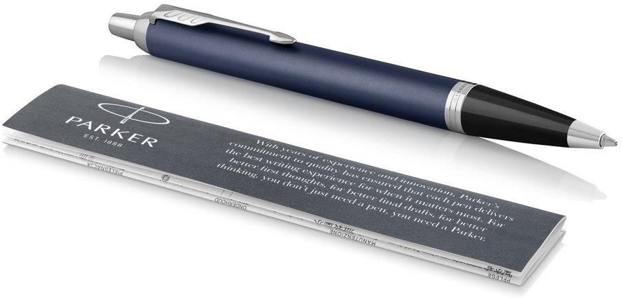 Matowy, niebieski lakier i chromowane pierścienie. _W opakowaniu prezentowym Parker. Pewność i profesjonalizm._Solidny partner. Inteligentny, pewny i profesjonalny. Linia Parker IM to stalówki ze stali nierdzewnej i wykończenia oddające najlepszą tradycję marki. Każdy detal linii zaprojektowany …