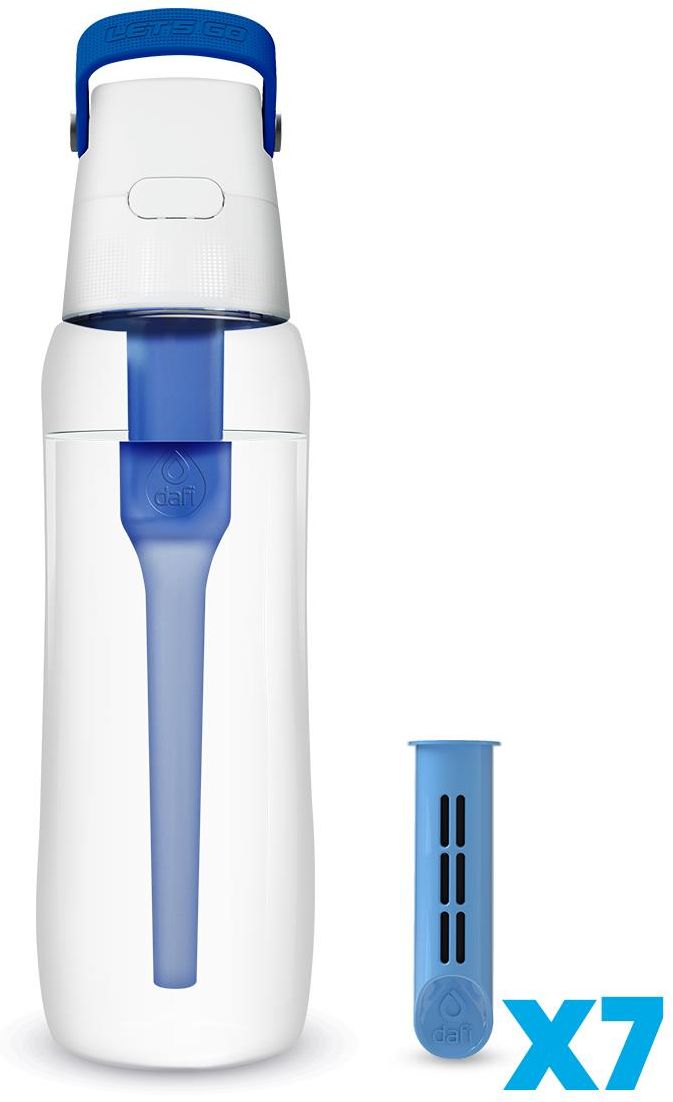 Butelka filtrująca Dafi SOLID 0,7 l szafirowa (niebieska) + filtr węglowy Butelka filtrująca Dafi Solid 700 ml – Czysta woda zawsze pod ręką! Masz dość noszenia ciężkich zgrzewek z wodą? Postaw na rozwiązanie praktyczne, oszczędne i ekologiczne! Butelka filtrująca Dafi Solid 700 ml w wybranym kolorze to sposób na świeżą i smaczną wodę z kranu — gdziekolwiek jesteś. Wygodna i lekka – zabierz ją do pracy, szkoły, na trening lub w podróż. Wyposażona w filtr węglowy z łupin kokosa, który skutecznie redukuje smak i zapach chloru. Pojemność 700 ml to idealna ilość, by zawsze mieć wodę przy sobie, bez konieczności kupowania plastikowych butelek. Filtr wystarcza na miesiąc lub około 150 litrów przefiltrowanej wody. Dlaczego warto? Trwały i bezpieczny materiał Tritan™ (bez BPA) Smaczna woda bez chloru, ale z naturalnymi minerałami (wapń, magnez) Ergonomiczny kształt i wygodne otwieranie na klik Wspierasz środowisko – rezygnujesz z plastiku jednorazowego Oszczędzasz – koszt 1 litra to grosze Specyfikacja Pojemność: 700 ml Kolor: szafirowy (niebieski) Wysokość: 284 mm Średnica: 76 mm Materiał: Tritan™ (wolny od BPA) Filtr: węglowy z łupin kokosa (w zestawie) Wydajność filtra: do 150 litrów lub 30 dni Proste użytkowanie Włóż filtr do butelki. Napełnij wodą z kranu. Wstrząśnij kilka razy. Gotowe – możesz pić smaczną wodę bez chloru! Zbiornik butelki można myć w zmywarce (pozostałe elementy – ręcznie, w max. 50°C). Postaw na zdrowie, wygodę i ekologię. Zamów teraz i zapomnij o jednorazowych butelkach! Butelka filtrująca Dafi SOLID 0,7 l szafirowa (niebieska) + filtr węglowy