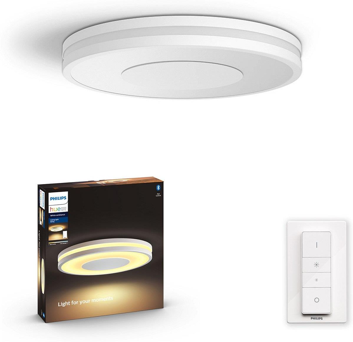 Philips Hue  oświetlenie Being Lampa sufitowa Being z wbudowanym źródłem światła LED zapewnia szeroką paletę białego światła (od chłodnej do ciepłej bieli). Ciesz się eleganckim wzornictwem i pięknym blaskiem oświetlającym dół i sufit. Dołączony regulator przyciemniania zapewnia wygodne sterowanie światłem. Można podłączyć do systemu inteligentnego oświetlenia Philips Hue. Regulator przyciemniania w zestawie Wbudowane źródło światła LED Inteligentne sterowanie dzięki mostkowi Hue* Biały Wysoka efektywność świetlna Wysokiej jakości światło z silnym strumieniem świetlnym zapewnia białe oświetlenie doskonałe na każdą porę dnia i do wykonywania każdej czynności. Łatwe, bezprzewodowe sterowanie za pomocą regulatora przyciemniania (w zestawie) Zasilany bateriami regulator przyciemniania Philips Hue pozwala na łatwe sterowanie białymi źródłami światła, zapewniając nastrojowe oświetlenie. Przełączanie pomiędzy 4 poziomami intensywności oświetlenia jest proste i odbywa się za naciśnięciem przycisku. Regulator przyciemniania można umieścić w dowolnym miejscu pomieszczenia za sprawą jego niewielkiej, eleganckiej stacji dokującej, natomiast samo urządzenie nie wymaga żadnych przewodów. Korzystaj z niego jak z pilota zdalnego sterowania lub zawieś na ścianie, aby cieszyć się sceną świetlną odpowiednią do każdej pory dnia. Pojedynczy regulator przyciemniania może sterować nawet 10 punktami świetlnymi Hue. Różne tryby oświetlenia: Relaks, Czytanie, Koncentracja i Energia Światło wpływa na nasz nastrój i zachowanie. Philips Hue może pomóc Ci zmienić codzienne czynności w chwile pełne przyjemności. Zamiast porannej kawy wybierz dzienne, chłodne, jasne światło białe, które zapewnia zastrzyk energii dla ciała i umysłu na cały dzień. Zachowaj skupienie dzięki odpowiednio dostosowanemu naturalnemu, jasnemu światłu białemu. Możesz też wyciągnąć się w fotelu i zrelaksować po długim dniu w otoczeniu delikatnie przyciemnionego światła białego. Stwórz wyjątkowy nastrój za pomocą wybranego koloru światła – od ciepłej bieli po jasne światło dzienne Stwórz wyjątkowy nastrój dopasowany do Twoich potrzeb i wykonywanych czynności. Poznaj wszystkie kolory białego światła – od mroźnego białego światła jak z zimowego pejzażu, po naturalne jasne oświetlenie przypominające wiosenny świt czy ciepłą biel zachodzącego letniego słońca. Budź się i zasypiaj w naturalny sposób Philips Hue pomaga wstać z łóżka w dobrym nastroju i w pełni wypoczętym. Stopniowo zwiększająca się jasność światła rozświetla sypialnię niczym wschód słońca. W naturalny sposób delikatnie wybudza domowników, zastępując hałaśliwe i nagłe wyrwanie ich budzikiem z głębokiego snu. Zacznij dzień na spokojnie, a wieczorem zrelaksuj się w otulającym, ciepłym białym świetle, powoli przygotowującym ciało do regenerującego snu. Do skorzystania z tej funkcji potrzebny jest mostek Philips Hue Bridge. Pełna kontrola zdalna kontrola dzięki mostkowi Hue Podłącz oświetlenie Philips Hue do mostka, aby korzystać z nieograniczonych możliwości systemu. Zdalne sterowanie, w domu i na zewnątrz Za pomocą aplikacji mobilnej Philips Hue (dostępna na systemu iOS i Android) można zdalnie sterować oświetleniem z dowolnego miejsca. Będąc poza domem, masz możliwość w każdej chwili sprawdzić, czy wyłączyłeś światło i z łatwością włączyć je na swój powrót. Do zdalnego sterowania oświetleniem konieczny mostek Philips Hue. Ustaw automatyczne harmonogramy włączania i wyłączania się światła Funkcja harmonogramu włączania i wyłączania się światła zapewni Ci wygodę, zarówno gdy jesteś jak i gdy nie ma Cię w domu. Możesz sterować oświetleniem zdalnie, ustawić automatyczne włączanie światła na Twój powrót do domu. Philips Hue to oświetlenie, które możesz całkowicie dostosować do swoich potrzeb – ustawienia światłą w każdym pokoju mogą być różne. Harmonogram wieczorny pozwoli na stopniowe przyciemnianie świateł, aż do całkowitego wyłączenia. Do korzystania z fukncjii automatyzacji oświetlenia niezbędny jest mostek Hue. Steruj światłem jak chcesz Podłącz oświetlenie Philips Hue do mostka i zacznij odkrywać niezliczone możliwości kontroli światła. Steruj oświetleniem za pomocą smartfonu lub tabletu przez aplikację mobilną Philips Hue lub skorzystaj z dedykowanych przełącznikóww obsługujących lampy i żarówki Hue. Ustawiaj zautomatyzowane harmonogramy świecenia, powiadomienia, alarmy i wiele innych funkcji, aby w pełni wykorzystać możliwości systemu Philips Hue. Philips Hue współpracuje takżę z technologiami Amazon Alexa, Apple HomeKit i Google Home, które umożliwiają sterowanie oświetleniem za pomocą głosu. Poznaj Philips HUE