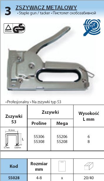 Zszywacz tapicerski A 53 4-8mm Proline 55028 Zszywacz metalowy PROLINE 55028 to trwałe narzędzie do mocowania zszywek typu A53 o wysokości 6-10 mm. Wykonany z metalu, co zapewnia solidność. Idealny do tapicerki, dekoracji, lekkich prac budowlanych i hobby. Gwarantuje niezawodność i jakość dzięki …