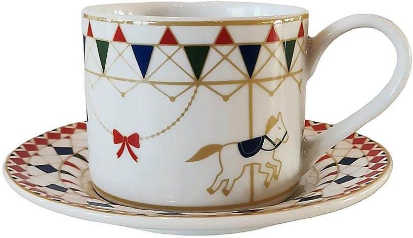 Opis Linii Zanurz się w świątecznej atmosferze, dzięki naszej wyjątkowej kolekcji Xmas Carousel. Zainspirowana czarem tradycyjnych jarmarków i nostalgiczną atmosferą Bożego Narodzenia, ta kolekcja emanuje ciepłem, radością i magią zbliżających się świąt. Każdy element serii został zaprojektowany z niezwykłą dbałością o detale, od wyboru wysokogatunkowych materiałów po subtelne zdobienia i akcenty kolorystyczne. Niezależnie od tego, czy chodzi o delikatną lamówkę czy malownicze motywy, Xmas Carousel jest synonimem elegancji i klasycznego uroku świątecznego. Dzięki linii Xmas Carousel, Twój dom zyska niepowtarzalny charakter i stanie się miejscem, gdzie tradycja łączy się z nowoczesnością, a wspomnienia z przyszłością. Odkryj razem z nami niezwykłe chwile, dzięki bajecznej serii Xmas Carousel. Opis Produktu Przygotuj się na niezwykłe świąteczne doznania z naszym zestawem z linii Xmas Carousel. Ten komplet jest stworzony specjalnie dla Ciebie, jeśli cenisz sobie zarówno gorące, jak i zimne napoje podane w stylowym naczyniu. Kubek z tej serii, wykonany z najwyższej jakości porcelany, posiada pojemność 350 ml, co czyni go idealnym wyborem nie tylko do delektowania się ulubioną kawą, ale także herbatą, aromatycznymi naparami ziołowymi czy słodkim kompotem podczas świątecznych wieczorów. Jego wyjątkowy design odzwierciedla gwiazdkową kolorystykę i jest subtelnie podkreślony przez charakterystyczny motyw bożonarodzeniowego jarmarku, dodając naczyniu niezwykłego charakteru. Znajdujący się w zestawie talerzyk nie tylko doskonale komponuje się z kubkiem, ale również stanowi praktyczne uzupełnienie podczas serwowania ciasteczek czy innych świątecznych przekąsek. Jest to element, który nie tylko ułatwi codzienne rytuały, ale również stanie się estetycznym dodatkiem, wnosząc odświętną atmosferę do Twojego domu. Wybierając nasz kubek ze spodkiem z kolekcji Xmas Carousel, zyskujesz nie tylko praktyczny element wyposażenia domu, ale także małe dzieło sztuki, które uprzyjemni chwile relaksu spędzone w gronie najbliższych. To idealny prezent, który zachwyci każdego miłośnika świątecznego nastroju i eleganckiego designu. Cechy szczególne Świąteczna edycja W zestawie z dopasowanym spodkiem Motyw bożonarodzeniowego jarmarku Idealny pomysł na prezent Wykonany z porcelany