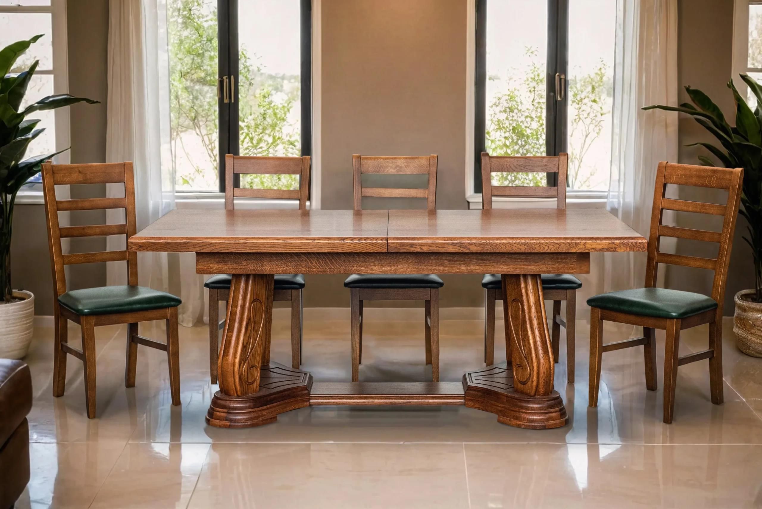 Stół Capri 200/100 cm + 2x50 cm + 6 krzeseł CortezZdjęcie przedstawia rzeczywisty wygląd produktu. Nie jest wizualizacją komputerową.Klasyczna Elegancja i TrwałośćStół Capri to wyjątkowe połączenie klasycznego stylu i trwałości, które wnosi elegancję do każdego wnętrza. Cała podstawa i rama stołu wykonane są z litego drewna dębowego, co zapewnia wyjątkową wytrzymałość i długowieczność. Krawędź blatu jest frezowana, dodając mu subtelnych detali i elegancji, a blat fornirowany dębem zachwyca naturalnym pięknem.Dzięki wymiarom 100x200 cm i dwóm dodatkowym wkładkom po 50 cm, stół Capri łatwo dopasowuje się do potrzeb, oferując przestrzeń zarówno na codzienne posiłki, jak i większe przyjęcia. System rozkładania oparty na solidnych prowadnicach metalowych gwarantuje płynne i bezproblemowe użytkowanie.Unikatowy i ponadczasowy design stołu Capri podkreślają ozdobne rzeźbienia, które nadają mu niepowtarzalnego charakteru. Ten piękny, solidny stół to inwestycja w jakość i styl, która przetrwa lata, wnosząc do Twojego domu nie tylko funkcjonalność, ale i elegancję.Krzesło w w najlepszym wydaniu Krzesło Cortez wykonane z wysokiej jakości drewna, przykuwa uwagę swoim niebanalnym, ponadczasowym designem– klasycznym oparciem stworzonym ze specjalnie wyselekcjonowanych listw oraz obiciem siedziska w naturalnej włoskiej skórze, stając się doskonałym dopełnieniem wielu stołów dostępnych w naszej ofercie.Wymiary stołu: 100x200 cm + 2 wkładki 50 cm Krzesło Cortez: wysokość: 100 cm wysokość do siedziska: 46 cm szerokość: 43 cm głębokość: 47 cm Realizuję również meble na indywidualne zamówienie (wymiary, strony, szycia, wzory, układy, wybarwienia listew wykończeniowych itp.). WYBARWIENIA DREWNASKÓRY NATURALNESKÓRY SYNTETYCZNENaszym priorytetem jest dokonanie wszelkich starań, aby Nasi klienci byli zadowoleni.Meble wykonane są z wysokiej jakości polskich materiałów. Aby uzyskać więcej informacji, proszę o kontakt z naszymi sprzedawcami: Tel: 788 509 803Tel: 661 442 118 Istnieje możliwość obejrzenia oferowanych przez naszą firmę mebli przez 6 dni w tygodniu. Od poniedziałku do piątku w godzinach 8:00-17:00 oraz w sobotę od godziny 8:00 do 12:00 w siedzibie naszej firmy. UWAGA! WNOSZENIE TOWARU W ZAKRESIE KLIENTA! MEBLE MIESZCZĄ SIĘ W DRZWIACH 80 CM.Czas realizacji zamówienia od 3 do 6 tygodni. Możliwy szybszy czas realizacji, jeśli dany model znajduje się na stanie magazynowym.