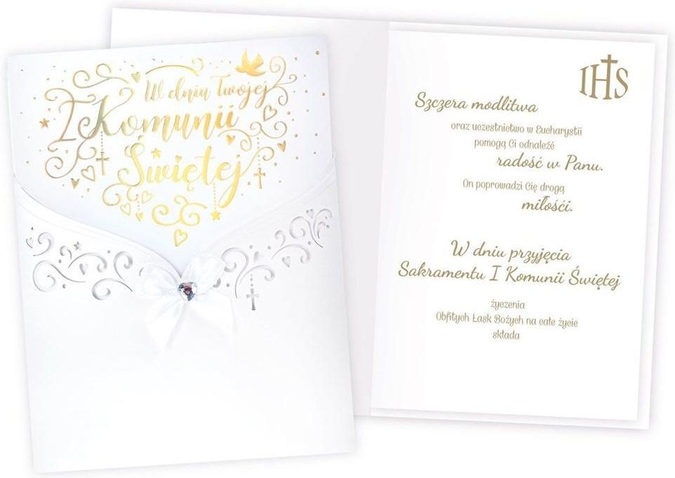 Kartki z serii Primus, to kartki najwyższej jakości, pięknie zdobione m.in złotą lub srebrną folią,tłoczeniami, czy wycinkami laserowymi. Idealne na najważniejsze okazje w życiu, takie jak ślub, komunia. W środku każdej kartki znajdują się dobrane do okazji życzenia, a do kartki dołączona jest dopasowana koperta. Cechy szczególne: wielkość: niestendardowa, prostokątna, kwadratowa, zdobienia: dekoracje ze złotej folii, doklejane koraliki, tłoczenia koperta: dopasowana w komplecie, wnętrze kartki: życzenia w środku, okazja: komunia.