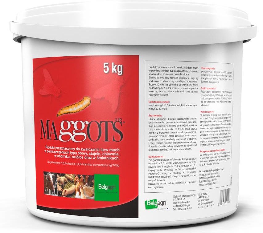 Maggots Preparat na larwy much 5kg Maggots to skuteczny preparat do zwalczania larw much, który stanowi niezbędny element w utrzymaniu czystości i higieny w miejscach, gdzie przebywają zwierzęta hodowlane. Opracowany przez firmę Fregata, ten proszek o wadze 5 kg jest idealnym rozwiązaniem dla gospodarstw rolnych, które borykają się z problemem obecności tych insektów. Dzięki swojej skuteczności i łatwości użycia, Maggots zyskuje uznanie wśród użytkowników. Przeznaczenie i skuteczność Preparat Maggots wyróżnia się wysoką skutecznością w zwalczaniu larw much, które mogą stanowić poważne zagrożenie dla zdrowia zwierząt oraz jakości ich środowiska. Dzięki silnej substancji czynnej - cyromazynie, środek doskonale sprawdza się w eliminacji larw w oborniku, stajniach oraz innych miejscach, w których mogą się gromadzić te niepożądane owady. Jego działanie ma na celu zmniejszenie liczebności much, co jest kluczowe w utrzymaniu zdrowego środowiska dla zwierząt. Pojemność i wydajność Preparat dostępny jest w dużym opakowaniu o wadze 5 kg, co czyni go wyjątkowo ekonomicznym rozwiązaniem. Wystarcza on na pokrycie powierzchni do 200 m² obornika, co sprawia, że użytkownik zyskuje długotrwałą ochronę przed larwami much. Taka pojemność jest szczególnie korzystna w większych gospodarstwach, gdzie problem z insektami jest bardziej nasilony. Zakres stosowania Maggots może być stosowany w różnych środowiskach, co czyni go wszechstronnym narzędziem w walce z owadami. Może być aplikowany w stajniach, chlewniach, oborach oraz śmietnikach. Dodatkowo, preparat jest bezpieczny w pobliżu zwierząt, co pozwala na jego użycie w gospodarstwie bez obaw o zdrowie hodowanych zwierząt. Rodzaj opakowania Ten preparat jest dostępny w wygodnym opakowaniu 5 kg, które zapewnia łatwość przechowywania i użytkowania. Duża pojemność to istotny atut, zwłaszcza w kontekście długotrwałego stosowania w gospodarstwie. Solidne opakowanie gwarantuje, że produkt zachowa swoje właściwości i skuteczność. Bezpieczeństwo Bezpieczeństwo stosowania środka jest istotnym aspektem, który powinien być brany pod uwagę przy wyborze preparatu do zwalczania owadów. Brak szkodliwych substancji chemicznych sprawia, że jest on nietoksyczny, co czyni go odpowiednim do użytku w miejscach, gdzie przebywają dzieci i zwierzęta. Takie właściwości sprawiają, że preparat cieszy się uznaniem wśród użytkowników szukających bezpiecznych rozwiązań. Instrukcje użytkowania Stosowanie preparatu jest proste i intuicyjne. Należy go rozcieńczyć z wodą, a następnie aplikować metodą oprysku lub polewania w miejscach, gdzie występują larwy much. Regularność stosowania preparatu przyczynia się do długotrwałego efektu w eliminacji niechcianych owadów. Kluczowe zalety preparatu Oto najważniejsze cechy, które wyróżniają preparat Maggots: Skuteczność: efektywnie zwalcza larwy much dzięki silnej substancji czynnej, Wydajność: duża pojemność 5 kg wystarcza na pokrycie 200 m², Bezpieczeństwo: nietoksyczny, bezpieczny w pobliżu dzieci i zwierząt, Łatwość użycia: prosty w aplikacji, można stosować metodą oprysku lub polewania, Szeroki zakres zastosowania: może być stosowany w różnych miejscach, w tym w stajniach i chlewniach. Sposób aplikacji Preparat można aplikować na dwa sposoby: przez rozpylanie lub polewanie. Taka elastyczność w metodzie aplikacji pozwala na dostosowanie sposobu stosowania do indywidualnych potrzeb oraz warunków panujących w danym miejscu. Zapach Preparat Maggots nie wydziela intensywnych zapachów, co sprawia, że jego stosowanie jest komfortowe. Można go używać nawet w zamkniętych pomieszczeniach bez obaw o nieprzyjemne aromaty. Czas działania Preparat oferuje długotrwałą skuteczność, co jest istotne w kontekście utrzymania niskiej liczebności larw much w danym miejscu. Jego regularne stosowanie zapewnia efektywną kontrolę nad populacją owadów. Składniki aktywne Najważniejszym składnikiem aktywnym jest cyromazyna, która odpowiada za skuteczność preparatu w eliminacji larw much. Dzięki zastosowaniu tego składnika, preparat jest efektywnym rozwiązaniem w walce z uciążliwymi insektami.