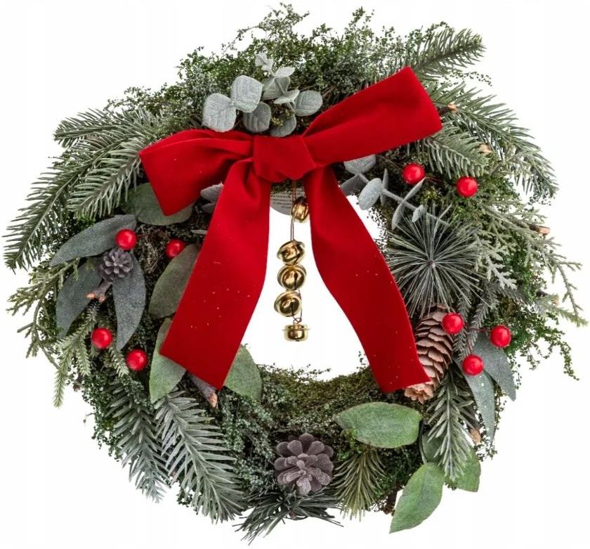 Wianek zimowy z kokardą – klasyczna świąteczna ozdoba, idealna na drzwi lub nad kominek. Dlaczego warto: Świąteczny wianek dodaje wnętrzu domu tradycyjnego uroku i elegancji. Wysoka jakość wykonania pozwala cieszyć się dekoracją przez wiele sezonów. Doskonale komponuje się z różnymi stylami wnętrz, dodając subtelny akcent. Miękka, czerwona kokarda dodaje elegancji i ciepła. Jest idealny do zawieszenia na drzwiach lub jako centralna dekoracja stołu. To gotowa ozdoba, która nie wymaga dodatkowego przystrajania – wystarczy powiesić. Wianek ułożony jest na styropianowym korpusie, dzięki czemu jest lekki i ustawny. Opis produktu: Świąteczny klimat zaczyna się od detali, które wprowadzają do wnętrza ciepło, radość i magię zimowego nastroju. Wianek zimowy z kokardą to klasyczna ozdoba, która pięknie podkreśli wyjątkowy charakter Bożego Narodzenia i sprawi, że Twój dom zyska niepowtarzalny urok już od progu. Wykonany z gałązek przypominających naturalne igliwie, ozdobiony czerwonymi jagodami, szyszkami i miękką aksamitną kokardą, wianek zachwyca elegancją i świątecznym wdziękiem. Złote dzwoneczki dodają mu subtelnego blasku i przywołują atmosferę radosnych chwil spędzanych w rodzinnym gronie. Idealny do zawieszenia na drzwiach, ścianie lub kominku, stanie się centralnym punktem zimowej dekoracji wnętrza.