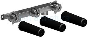 element podtynkowy Podtynk, mosiądz DR 2 x przyłącze gwint wewnętrzny 1/2" 1 x odprowadzenie gwint wewnętrzny 1/2" 3 x pokrywy ochronne podtynku rozstawienie 200 mm 3 x korki zamykające 1/2" śruby mocujące blok styropianowy