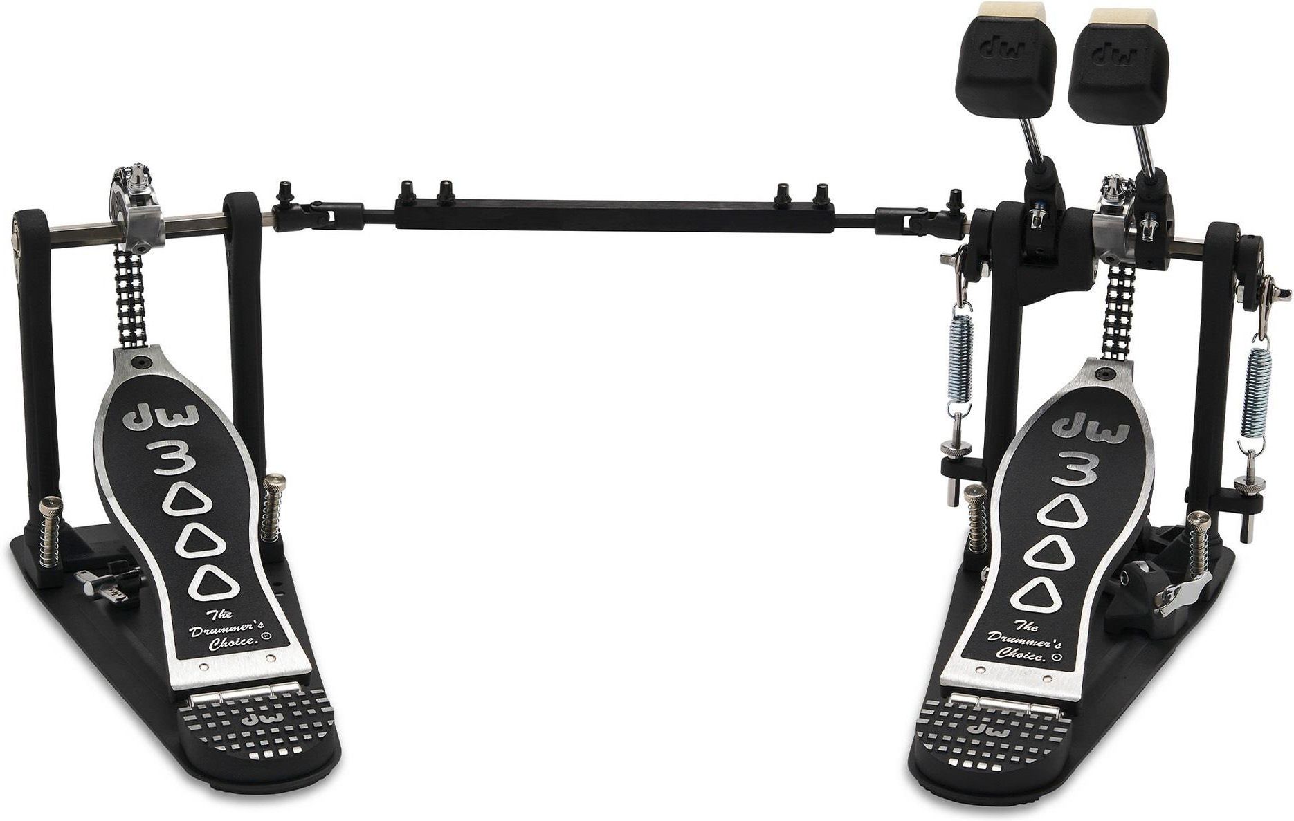 Podwójna stopa z serii 3000 firmy DW Drums. Podwójny łańcuch Napęd akcelerator Aluminiowy zawias przy płycie Zaiweszenie z łożyskiem kulkowym Regulowany bijak z funkcją pamięci Łatwo dostępny zacisk obręczy Bijak dwustronny DW101 Stalowa płyta podstawy z antypoślizgową gumą W komplecie klucz do strojenia