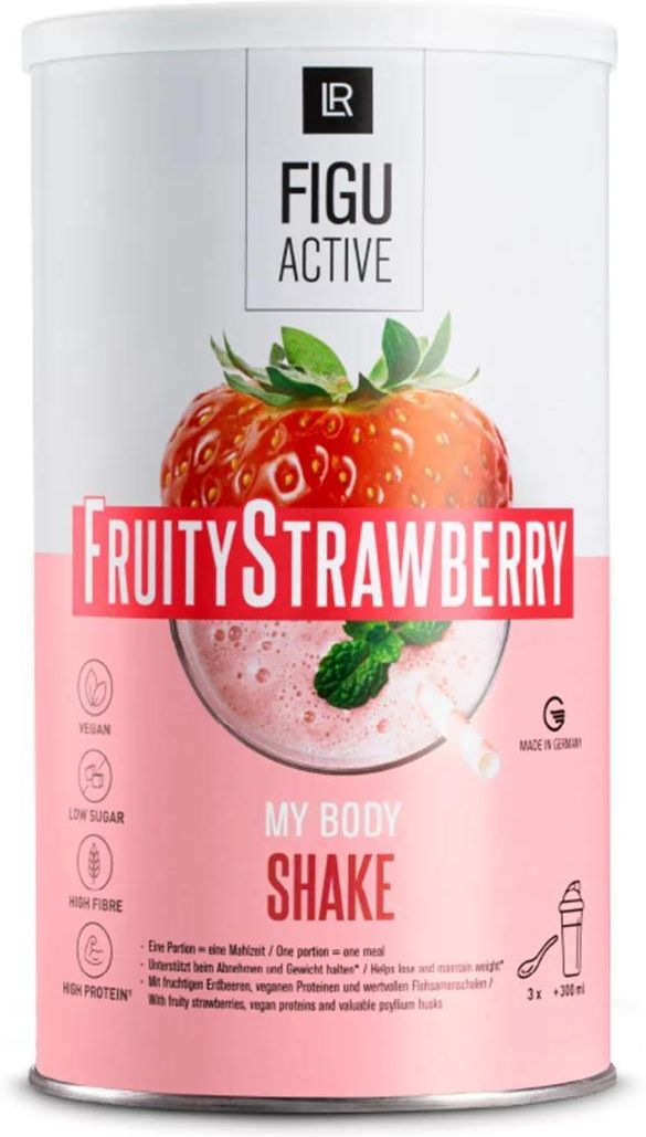 LR FIGUACTIVE Fruity Strawberry Shake - truskawkowy Kremowy shake o smaku truskawkowym Do odchudzania i utrzymywania wagi1 – 1 porcja zastępuje pełny posiłek W 100 % wegański, słodzony stewią, tylko naturalne aromaty Wysoka zawartość błonnika – m.in. z łusek babki jajowatej Wysoka zawartość białka – z grochu, bobu i soi Bez glutenu, laktozy, oleju palmowego, sztucznych barwników i wzmacniaczy smaku LR FIGUACTIVE Fruity Strawberry Shake - truskawkowy Owocowa pokusa! Marzysz o owocowej, słodkiej chwili zapomnienia? Skuś się na pyszny koktajl truskawkowy LR FIGUACTIVE Fruity Strawberry. Bez względu na to, czy Twoim celem jest schudnięcie1, utrzymanie stabilnej wagi1 czy po prostu chcesz zaoszczędzić czas, nasze koktajle to dobry wybór. Pysznie smakują, zastępują kompleny posiłek i zawierają wiele cennych składników. Każda porcja stanowi pełnowartościowy posiłek. Sięgając po shake LR FIGUACTIVE, idealnie łączysz ograniczanie kalorii z dostarczaniem swojemu organizmowi wszystkich niezbędnych składników odżywczych. Składniki Składniki: Izolat białka sojowego (31 %), maltodekstryna, olej kokosowy, białko grochu (8 %), sproszkowana łuska babki jajowatej (6 %), inulina (5 %), emulgator: lecytyny sojowe; naturalny aromat, izolat białka bobu (2 %), węglan wapnia, fosforan wapnia, barwnik: sproszkowany sok z buraków; wodorotlenek magnezu, fosforan potasu, substancja słodzaca: glikozydy stewiolowe ze stewii; proszek truskawkowy (0,2 %), kwas: kwas cytrynowy, kwas winowy; substancja przeciwzbrylająca: dwutlenek krzemu; sól, kwas L-askorbinowy, tlenek cynku, pirofosforan żelaza(III), amid kwasu nikotynowego, D-pantotenian wapnia, octan D-alfa-tokoferylu, siarczan manganu, przeciwutleniacz: alfa-tokoferol; węglan miedzi(II), ryboflawina, chlorowodorek pirydoksyny, monoazotan tiaminy, octan retinylu, kwas pteroilomonoglutaminowy, jodek sodu, selenian(IV) sodu, filochinon, D-biotyna, cholekalcyferol, cyjanokobalamina. ¹ Dzienna referencyjna wartość spożycia (RWS) ² w porcji (= w jednym posiłku): 31 g + 300 ml napoju sojowego ³ 3 łyżki stołowe (31 g proszku) wymieszać z 300 ml napoju sojowego (bez dodatków i niewzbogacanego witaminami / minerałami). Do tego celu użyj co najmniej 500 ml szklanki. Zalecamy przygotowanie w shakerze. Ciesz się posiłkiem jako zamiennikiem śniadania, obiadu lub kolacji. Spożywać natychmiast po przygotowaniu. Sposób stosowania Przygotowanie: *** 3 łyżki stołowe (31 g proszku) wymieszać z 300 ml napoju sojowego (bez dodatków i niewzbogacanego witaminami / minerałami). Do tego celu użyj co najmniej 500 ml szklanki. Zalecamy przygotowanie w shakerze. Ciesz się posiłkiem jako zamiennikiem śniadania, obiadu lub kolacji. Spożywać natychmiast po przygotowaniu. Wskazówka: w ramach niskokalorycznego sposobu odżywiania należy koniecznie zwracać uwagę na przyjmowanie odpowiedniej ilości płynów w ciągu dnia. W ciągu dnia należy wypijać 2-3 litrów bezkalorycznych napojów - najlepiej wody mineralnej lub niesłodzonej herbaty. Produkt prowadzi do zamierzonych efektów tylko w przypadku spożywania niskokalorycznych posiłków. Należy koniecznie zwracać uwagę na zbilansowana i zróżnicowaną dietę oraz zdrowy tryb życia. Inne środki spożywcze są niezbędna częścią tej diety. Posiłek zawiera wszystkie niezbędne składniki odżywcze w wystarczającej ilości. Należy przestrzegać wskazówek dotyczących przygotowania. Ten produkt zawiera inulinę. Ponieważ inulina ma stymulujący wpływ na pracę jelit i florę jelitową, jej zwiększone spożycie może powodować dolegliwości trawienne (np. wzdęcia, biegunka). Osoby z wrażliwym przewodem pokarmowym (np. „zespół jelita drażliwego”) przed spożyciem produktu powinny skonsultować się z lekarzem. Przed użyciem wstrząsnąć. Poziom napełnienia jest uwarunkowany technicznie. Przechowywać w suchym i chłodnym miejscu. Po otwarciu zużyć w ciągu 3 miesięcy.