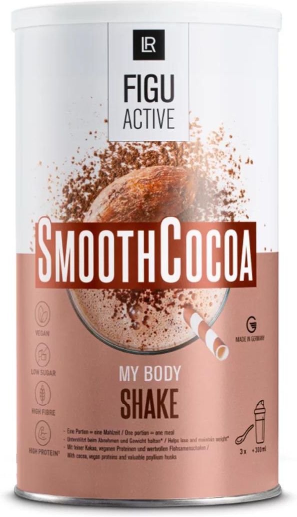 LR FIGUACTIVE Smooth Cocoa Shake – kakaowy Kremowy shake o smaku kakaowym Do odchudzania i utrzymywania wagi1 – 1 porcja zastępuje pełny posiłek W 100% wegański, słodzony stewią, tylko naturalne aromaty Wysoka zawartość błonnika – m.in. z łusek babki jajowatej Wysoka zawartość białka – z grochu, ciecierzycy i bobu Bez glutenu, laktozy, oleju palmowego, sztucznych barwników i wzmacniaczy smaku LR FIGUACTIVE Smooth Cocoa Shake – kakaowy CZEKOLADOWA, SŁODKA CHWILA Osłódź sobie dzień z czekoladowym koktajlem LR FIGUACTIVE Smooth Cocoa Shake. Bez względu na to, czy Twoim celem jest schudnięcie1, utrzymanie stabilnej wagi1 czy po prostu chcesz zaoszczędzić czas, nasze koktajle to dobry wybór. Pysznie smakują, zastępują kompleny posiłek i zawierają wiele cennych składników. Każda porcja stanowi pełnowartościowy posiłek. Sięgając po shake LR FIGUACTIVE, idealnie łączysz ograniczanie kalorii z dostarczaniem swojemu organizmowi wszystkich niezbędnych składników odżywczych. 1 Kontrola wagi: zastąpienie dwóch głównych posiłków dziennie takim zamiennikiem posiłku (LR FIGUACTIVE shake, zupa, płatki) pomaga w utracie wagi. Aby osiągnąć to działanie, należy zastąpić produktem dwa główne posiłki w ciągu dnia. Utrzymanie wagi: Zastąpienie jednego z trzech głównych posiłków w ciągu dnia zamiennikiem posiłku (LR FIGUACTIVE shake, zupa, płatki) pomaga w utrzymaniu masy ciała po utracie wagi. Aby osiągnąć to działanie, należy zastąpić produktem jeden posiłek w ciągu dnia Sposób stosowania Przygotowanie: *** 3 łyżki stołowe (31 g proszku) wymieszać z 300 ml napoju sojowego (bez dodatków i niewzbogacanego witaminami / minerałami). Do tego celu użyj co najmniej 500 ml szklanki. Zalecamy przygotowanie w shakerze. Ciesz się posiłkiem jako zamiennikiem śniadania, obiadu lub kolacji. Spożywać natychmiast po przygotowaniu. Wskazówka: w ramach niskokalorycznego sposobu odżywiania należy koniecznie zwracać uwagę na przyjmowanie odpowiedniej ilości płynów w ciągu dnia. W ciągu dnia należy wypijać 2-3 litrów bezkalorycznych napojów – najlepiej wody mineralnej lub niesłodzonej herbaty. Produkt prowadzi do zamierzonych efektów tylko w przypadku spożywania niskokalorycznych posiłków. Należy koniecznie zwracać uwagę na zbilansowana i zróżnicowaną dietę oraz zdrowy tryb życia. Inne środki spożywcze są niezbędna częścią tej diety. Posiłek zawiera wszystkie niezbędne składniki odżywcze w wystarczającej ilości. Należy przestrzegać wskazówek dotyczących przygotowania. Ten produkt zawiera inulinę. Ponieważ inulina ma stymulujący wpływ na pracę jelit i florę jelitową, jej zwiększone spożycie może powodować dolegliwości trawienne (np. wzdęcia, biegunka). Osoby z wrażliwym przewodem pokarmowym (np. „zespół jelita drażliwego”) przed spożyciem produktu powinny skonsultować się z lekarzem. Przed użyciem wstrząsnąć. Poziom napełnienia jest uwarunkowany technicznie. Przechowywać w suchym i chłodnym miejscu. Po otwarciu zużyć w ciągu 3 miesięcy.