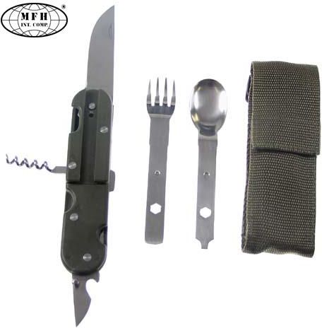 Niezbędnik MFH 3-częściowy w pokrowcu MFH - Max Fuchs Niezbędnik MFH 3-częściowy to składany zestaw turystyczny wyposażony w 5 narzędzi, przydatnych podczas każdego wypadu na biwak, ognisko oraz wycieczkę. Niezbędnik MFH- obowiązkowy element w kuchni każdego turysty Niezbędnik ma modułową konstrukcję przypominającą szwajcarski scyzoryk, z tą jednak różnicą, że wybrane narzędzia można odłączyć od szkieletu i używać osobno. Niezbędnik MFH ma wytrzymały szkielet z polimeru, w którym osadzono 5 narzędzi najbardziej przydatnych podczas outdoorowej aktywności. Wszystkie narzędzia niezbędnika wykonano z wysokiej jakości stali nierdzewnej, odpornej na korozję, przenoszenie zapachów i odkształcenia. Widelec i łyżkę zamocowano w zewnętrznych prowadnicach rękojeści, dzięki czemu dostęp do nich jest szybki i wygodny. Do przenoszenia zestawu otrzymujemy etui z wytrzymałego nylonu, wyposażone w szlufkę na pas oraz klapkę zamykaną na rzep. Ten funkcjonalny dodatek sprawia, że niezbędnik będzie w razie potrzeby cały czas w zasięgu ręki. Funkcję i narzędzia niezbędnika MFH: odłączana stalowa łyżka odłączany stalowy widelec małe ostrze gładkie korkociąg Producent: MFH Max-Fuchs, Niemcy Typ materiału: stal nierdzewna Długość całkowita [mm]: Elementy zestawu: pokrowiec Wysokość całkowita [mm]: Szerokość całkowita [mm]: Materiał rękojeści: polimer Czy składany?: tak Ilość funkcji: