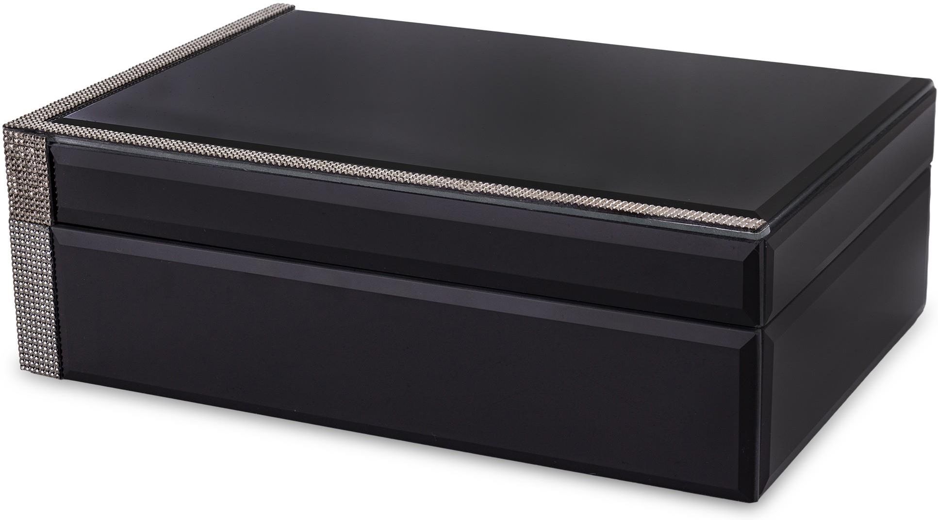 Szkatułka Na Biżuterię Szkatułki, Ramki i Tace / Kolekcja Vetrario Rozmiar: 8x24x16cm Pakowanie: 8/1 Waga: 1.36 kg Materiał: mdf, szkło Kolor: czarny, srebrny