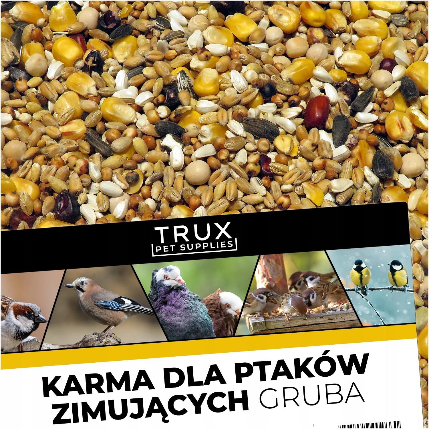 TRUX Karma dla ptaków dzikożyjących zimujących gruba 2,5kg TRUX Karma Zimowa dla Ptaków Dzikożyjących to starannie dobrana mieszanka większych nasion i ziaren, idealna dla ptaków, które preferują większe pokarmy. Produkt ten został stworzony z myślą o dostarczeniu dzikim ptakom wszystkich niezbędnych składników odżywczych, które pomogą im przetrwać trudne zimowe warunki. Naturalne źródła pożywienia w zimie są ograniczone, dlatego nasza karma zapewnia ptakom solidną dawkę energii, której potrzebują, aby pozostać w dobrej kondycji. W przeciwieństwie do karmy drobnej ziarna nie są grysowane (łamane). Najważniejsze korzyści Bogate źródło energii: Karma zawiera większe nasiona, bogate w tłuszcze i białka, które są kluczowe do utrzymania sił i ciepła w okresie zimowym. Dla większych gatunków: Większe ziarna są idealne dla ptaków o mocniejszych dziobach, takich jak gołębie, sójki czy drozdy. Łatwe stosowanie: Karma jest gotowa do użycia i doskonale sprawdza się w karmnikach lub na otwartej przestrzeni. TRUX Karma dla Ptaków to idealne rozwiązanie dla ptaków o większych wymaganiach pokarmowych. Dzięki większym nasionom i ziarnom, karma jest bardziej sycąca i dostosowana do potrzeb gatunków, które preferują większe kawałki pożywienia. Wspierasz w ten sposób różnorodność ptaków w swoim ogrodzie, jednocześnie zapewniając im potrzebne wsparcie w trudnym zimowym okresie. Produkty marki TRUX są synonimem wysokiej jakości i dbałości o detale. W każdym aspekcie produkcji wykorzystywane są wyłącznie najwyższej klasy ziarna, które są starannie selekcjonowane, aby zapewnić zwierzętom najwyższą wartość odżywczą. W procesie produkcji TRUX starannie wybiera dostawców oraz stawia na kontrolę jakości na każdym etapie od zbioru po pakowanie. Skład produktu Kukurydza extra żółta, Pszenica extra sortowana, Sorgo extra czerwone, Kasza jęczmienna, Groch żółty kalibrowany, Kukurydza bordo, Krokosz barwierski, Groch polny (peluszka), Sorgo białe, Groch zielony kalibrowany, Gryka zwyczajna, Słonecznik czarny sortowany, Słonecznik paskowany Iryga, Rzepak czarny, Siemię lniane.