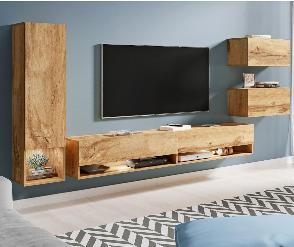 Meblościanka wisząca Amadeo to nowoczesne, eleganckie i funkcjonalne rozwiązanie do salonu, które łączy w sobie minimalistyczny design z praktycznym układem przestrzeni.Połączenie dębu wotan z subtelnym oświetleniem LED (opcjonalnie) nadaje wnętrzu wyjątkowego charakteru i sprawia, że całość prezentuje sięciepło i nowocześnie.Korpus meblościanki wykonany jest z solidnej płyty laminowanej. Dąb wotan dodaje wnętrzu elegancji i przytulności.Gładkie powierzchnie bez widocznych uchwytów podkreślają nowoczesny, minimalistyczny charakter zestawu, a system otwierania z wystającymi frontami poza korpus zapewnia wygodne i bezgłośne użytkowanie.Zestaw składa się z kilku funkcjonalnych elementów, które razem tworzą harmonijną kompozycję na ścianie telewizyjnej. Wysoka szafka wyposażona jest w cztery przestronne półki, idealne do przechowywania książek, dokumentów czy dekoracji. Część dolna posiada otwartą wnękę z efektownym podświetleniem, które pozwala wyeksponować ozdobne elementy i nadaje wnętrzu przytulnego klimatu.Pod telewizorem umieszczona jest długa, wisząca szafka RTV o szerokości 180 cm i wysokości 30 cm, z dwiema dużymi komorami wyposażonymi w klapy otwierane do dołu. Dzięki temu idealnie sprawdza się jako miejsce na sprzęt multimedialny, dekodery, konsole czy kolekcję filmów. Otwory na przewody w tylnej ściance zapewniają estetyczne i dyskretne poprowadzenie kabli.Całość uzupełniają dwie mniejsze szafki wiszące o wymiarach 60 × 32,5 × 28,5 cm, które można zamontować dowolnie – symetrycznie lub asymetrycznie – dostosowując układ do własnych preferencji i przestrzeni w salonie.Wymiary:Model objęty jest 2 letnią gwarancją producenta.Produkt dostarczymy do Państwa BEZPŁATNIE pod wskazany adres na terenie całego kraju.Mebel wymaga samodzielnego montażu, zgodnie z załączoną instrukcją.Co WAŻNE: zgodnie z prawem i naszymregulaminemmają Państwo pełne prawo do zwrotu nieużywanych towarów, jeśli nie spełnią one Państwa oczekiwań.