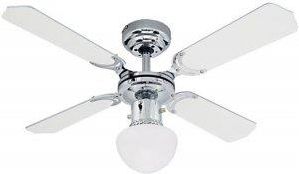 Markowy wentylator sufitowy WESTINGHOUSE. Dane techniczne: - rozpiętość łopatek 90 cm - 4 łopatek - łopatki dwustronne - białe/czarne - 1 punkt świetlny - przystosowany do 1 żarówki E27 60W - waga wentylatora ok. 4,3 kg - dwa kierunki obrotów - 3 prędkości obrotowe regulowane łańcuszkiem - 110/190/250 obr/min - pobór mocy silnika 21/30/44 W w zależności od obrotów - regulacja: łańcuszkami w komplecie lub dodatkowo naścienna lub pilotem - wysokość wentylatora 43 cm - nr katalogowy 78321 - znak CE i niemiecki znak jakości TUV i GS - gwarancja 2 lata