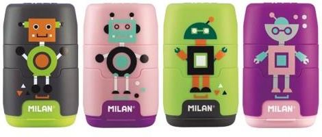 TEMPERÓWKA PODWÓJNA Z GUMKĄ HAPPY BOTS MILAN Temperówka podwójna z gumką do mazania Milan HAPPY BOTS Gumka do mazania oraz temperówka w jednym. Miękka, syntetyczna gumka do ścierania szerokiego zakresu grafitów ze wszystkich gatunków papieru. Temperówka posiada odporne ostrze z karbonu, zarazem bezpieczne dla dziecka. Plastikowa obudowa, z grafiką zaprojektowaną specjalnie dla hiszpańskiej firmy Milan. Specjalna edycja Happy Bots. MILAN