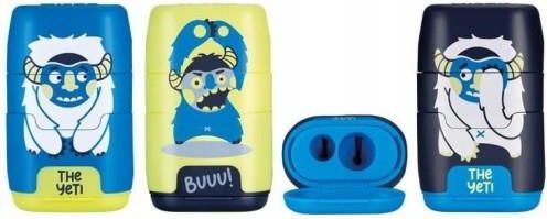 Fantazyjne połączenie gumki i temperówki w jednym. Z jednej strony podwójna temperówka na cienkie i grube kredki i ołówki. Z drugiej miękka gumka syntetyczna, a po środku pojemnik na ścinki. Wszystko w nowoczesnym designie nawiązującym do kolekcji THE YETI. Mają ostre i wytrzymałe ostrza ze stali węglowej dzięki czemu idealnie nadają się do wszystkich rodzajów ołówków. Posiadają system bezpiecznych ostrzy, który zapobiega odłączeniu się ostrza od korpusu temperówki. Rozmiar temperówko-gumki: 6,7 x 4 x 2,5 cm.