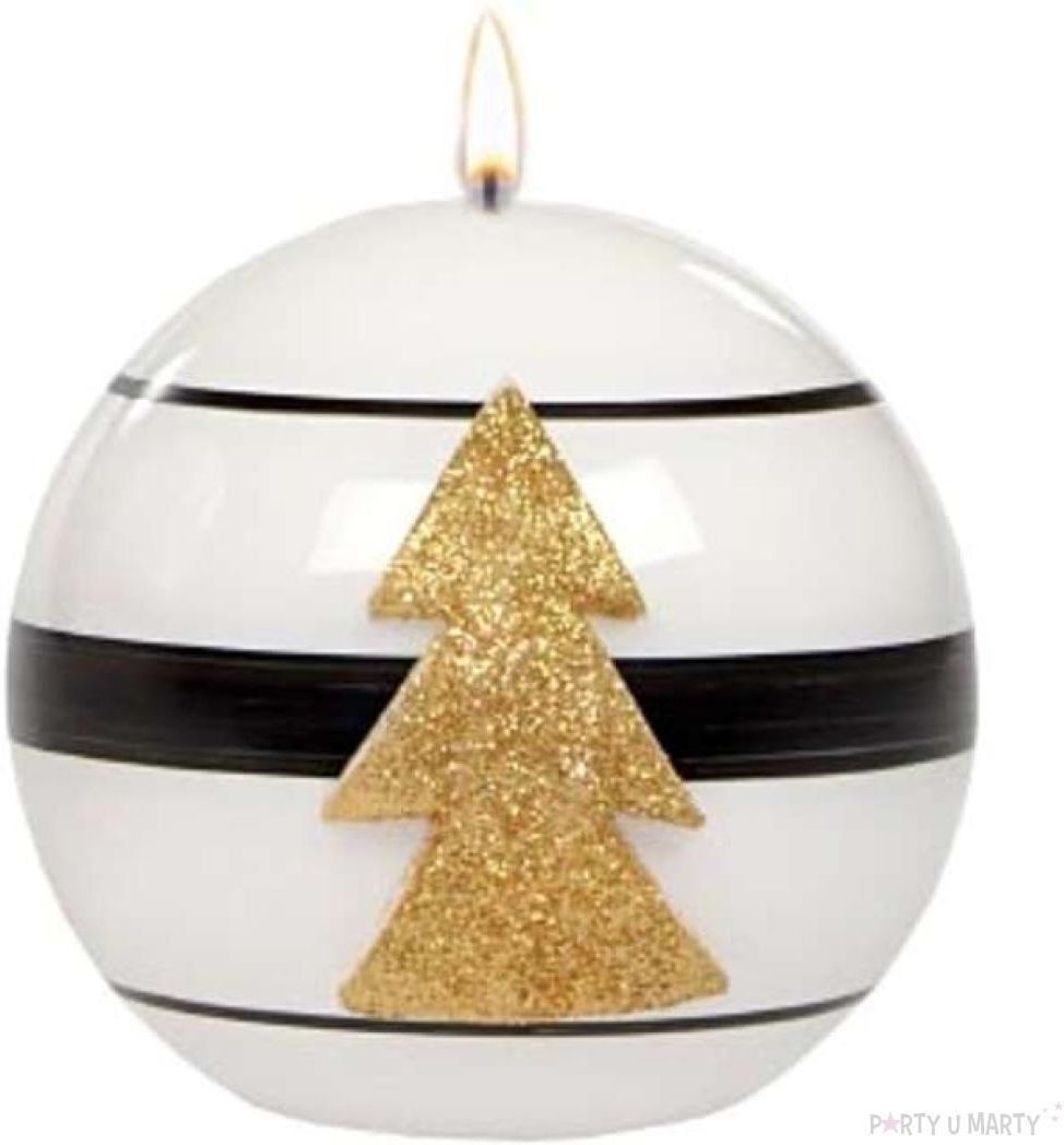 Świeca "Kula - Choinka", biała, Adpal, 80 mm Okrągła, świąteczna świeca w kolorze białym, o średnicy 80 mm z kolekcji Christmas Light. Zachwyca efektowne, zdobienie w postaci czarnych pasków, a na ich tle złota choinka. Czas palenia się świecy, to aż 22h, co niewątpliwie jest ogromnym atutem. …