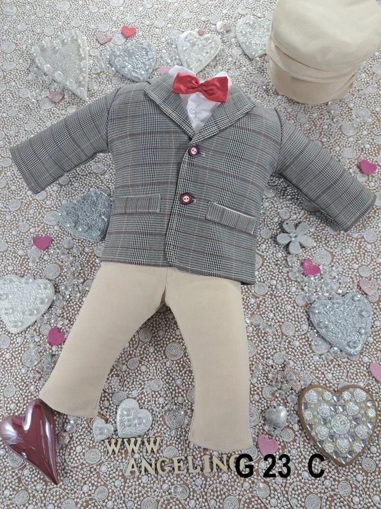 GARNITUREK DO CHRZTU dla chłopca beżowo brązowy 5- CZĘŚCIOWY GARNITUREK DO CHRZTU DLA CHŁOPCA. MARYNARKA KRATECZKA BEŻOWO - BRĄZOWA. Tkanina 100 % poliester. KASZKIET I SPODNIE KOLOR BEŻOWY. Tkanina poliester 100 %. MARYNARKA ZAPINANA NA DWA GUZICZKI KOSZULO- BODY Z 100 % BAWEŁNIANEJ TKANINY. GÓRA KOSZULKI ZAPINANA NA GUZICZKI, DÓŁ BODY ZAPINANE NA ZATRZASKI MUSZKA NA SILIKONOWEJ GUMCE KTÓRA NIE UWIERA MALEŃSTWA W SZYJKĘ. BARDZO WYGODNA DO ZAKŁADANIA, IDEALNIE SIĘ ROZCIĄGA A PO CHWILI WRACA DO STANU SPRZED ROZCIĄGNIĘCIA KASZKIET Z DASZKIEM SPODENKI TYPU SLIM Z GUMECZKĄ W PASIE. ELEGANCKI I WYJĄTKOWY GARNITUREK DO CHRZTU USZYTY PRZEZ NAS Z NAJLEPSZEJ JAKOŚCI BARDZO MIŁEJ I PRZYJEMNEJ W DOTYKU TKANINY. POLECANY NA WSZYSTKIE PORY ROKU DO GARNITURÓW IDEALNIE PASUJĄKURTKI, PŁASZCZE, BUCIKI, KTÓRE MOŻNA KUPIĆ ODDZIELNIE.WSZYSTKO WYKONANE Z WIELKĄ STARANNOŚCIĄ I DBAŁOŚCIĄ O SZCZEGÓŁY. Dzięki perfekcyjnemu wykończeniu, nasze produkty zachwycają jakością. ELEGANCJA I KOMFORT Pięcioczęściowy garniturek do chrztu dla chłopca w beżowo - brązowym kolorze to wyjątkowy zestaw, który łączy w sobie elegancję, a także komfort użytkowania. W skład kompletu wchodzi pięć starannie dobranych elementów: marynarka, koszulo-body, spodnie, kaszkiet i muszka. Każdy z jego elementów został zaprojektowany z myślą o wygodzie i eleganckim wyglądzie Twojego maluszka podczas tej ważnej uroczystości. DOSKONAŁY ZESTAW Marynarka, wykonana z tkaniny poliestrowej w beżowo-brązową krateczkę, zapewnia nie tylko stylowy wygląd, ale także maksymalny komfort noszenia. Zapięcie na dwa ozdobne guziczki dodaje całości elegancji, dzięki czemu Twój maluszek prezentuje się jak prawdziwy dżentelmen. Spodnie typu slim, które również zostały wykonane z tej samej tkaniny, doskonale dopasowują się do sylwetki dziecka, a gumka w pasie zapewnia dodatkową wygodę. Dzięki temu, komplet nie tylko wygląda elegancko, ale także zapewnia pełen komfort przez cały dzień. Koszulo-body w czystym, białym kolorze to element, który zachwyca zarówno swoją praktycznością, jak i elegancją. Góra koszuli zapinana na guziczki oraz dół body zapinany na zatrzaski sprawiają, że zakładanie i zdejmowanie stroju jest niezwykle proste. Wykonane w 100% z bawełny, koszulo-body jest przewiewne, a także delikatne dla skóry dziecka, co dodatkowo zwiększa komfort noszenia. Ten element zestawu idealnie łączy funkcjonalność z eleganckim stylem, co sprawia, że jest niezastąpiony podczas uroczystości chrztu. Czerwona muszka to nie tylko stylowy dodatek, ale także element, który dodaje całości wyjątkowego charakteru. Zamocowana na elastycznej gumce, muszka jest łatwa w zakładaniu, a także nie uwiera szyjki dziecka, co zapewnia komfort przez cały czas noszenia. Elegancka muszka dopełnia cały strój, podkreślając jego wyrafinowany charakter. Kaszkiet z daszkiem, utrzymany w tym samym kolorze co spodnie, tworzy spójne i stylowe zestawienie. Jednocześnie, kaszkiet chroni przed słońcem, zapewniając zarówno ochronę, jak i stylowy wygląd. Dzięki temu elementowi, cały komplet staje się jeszcze bardziej elegancki, a jednocześnie funkcjonalny.