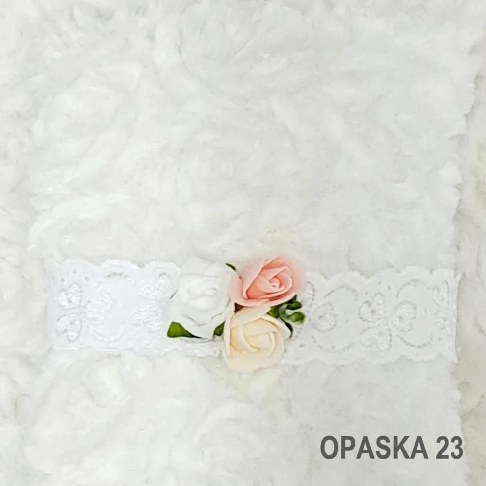 OPASKA DO CHRZTU dla dziewczynki biała OPASKA USZYTA PRZEZ NAS Z NAJLEPSZEJ JAKOŚCI BARDZO MIŁEJ I PRZYJEMNEJ W DOTYKU GUMOWANEJ ELASTYCZNEJ KORONKI POLECANA NA LATO, PÓŹNĄ WIOSNĘ I WCZESNĄ JESIEŃ OPASKA ELEGANCKO WYKOŃCZONA I OZDOBIONA WDZIĘCZNYMI, PIĘKNYMI KOLOROWYMI KWIATKAMI. Tkanina poliester 100 %. Obwód głowy rozmiar 56 36 - 38 cm, rozmiar 62 38 - 40 cm, rozmiar 68 40 - 42 cm, rozmiar 74 42 - 44 cm, rozmiar 80 44 - 46 cm, rozmiar 86 46 - 48 cm DO OPASKI IDEALNIE PASUJE SUKIENKA, BOLERKO, SWETEREK,TOREBKA, PŁASZCZ I BUCIKI KTÓRE MOŻNA KUPIĆ ODDZIELNIE. WSZYSTKO WYKONANE Z WIELKĄ STARANNOŚCIĄ I DBAŁOŚCIĄ O SZCZEGÓŁY. PERFEKCYJNIE WYKOŃCZONE.