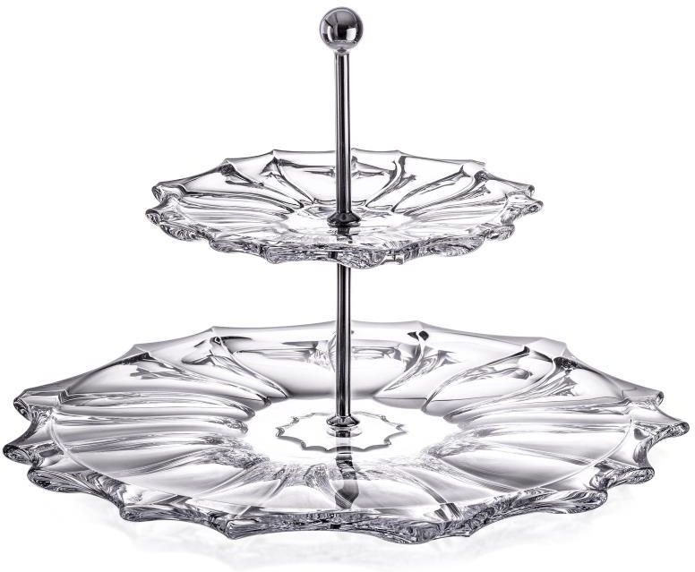 ETAŻERKA DWUPOZIOMOWA BOHEMIA PLANTICA 355 MM - doskonała dekoracja każdego stołu! Etażerka została wykonana z najwyższej jakości kryształowego szkła przez znaną czeską hutę szkła - Bohemia Crystalite. Piętrowa konstrukcja naczynia, sprawia,że ciasta, słodycze i owoce umieszczone na paterze, będą …