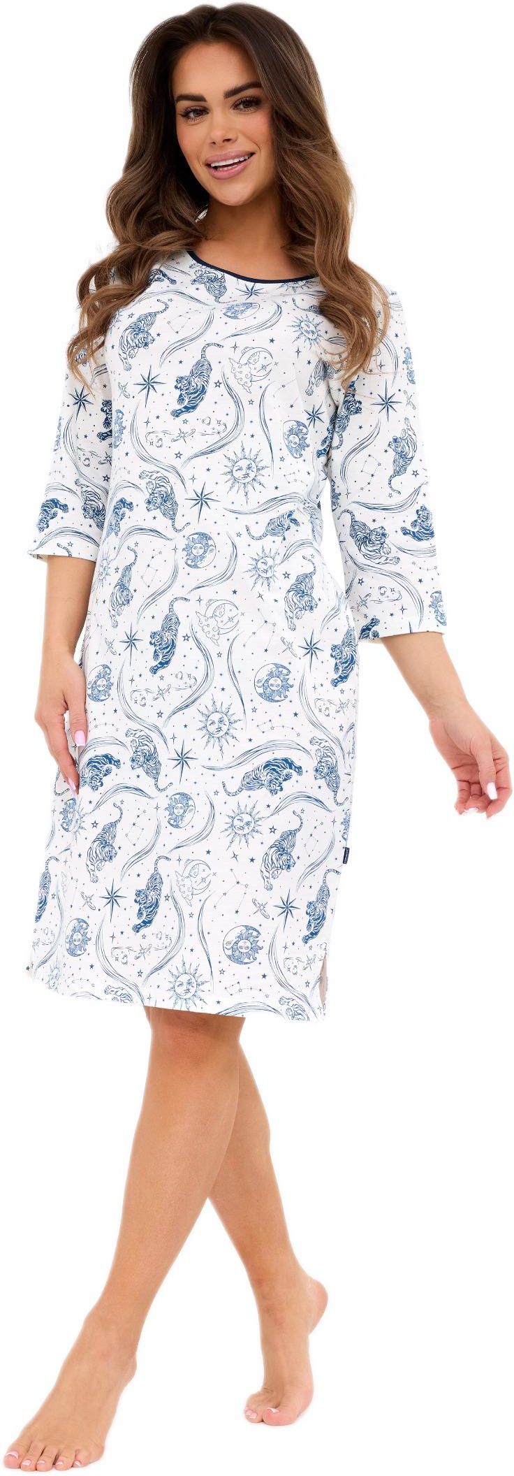 Koszula nocna damska INGRID – klasyka, kobiecość i wygodaKoszula nocna INGRID DR 464/448 to idealna propozycja dla kobiet, które cenią sobie klasyczny styl i komfortowy sen. Wykonana w 100% z wysokogatunkowej bawełny, jest miękka, przewiewna i przyjemna dla skóry. Model z rękawem długości 3/4 oraz okrągłym dekoltem zapewnia wygodę noszenia, a długość przed kolano z praktycznymi rozporkami po bokach gwarantuje pełną swobodę ruchów. Delikatny, romantyczny wzór podkreśla kobiecy charakter koszuli, czyniąc ją doskonałym wyborem na każdą porę roku.
