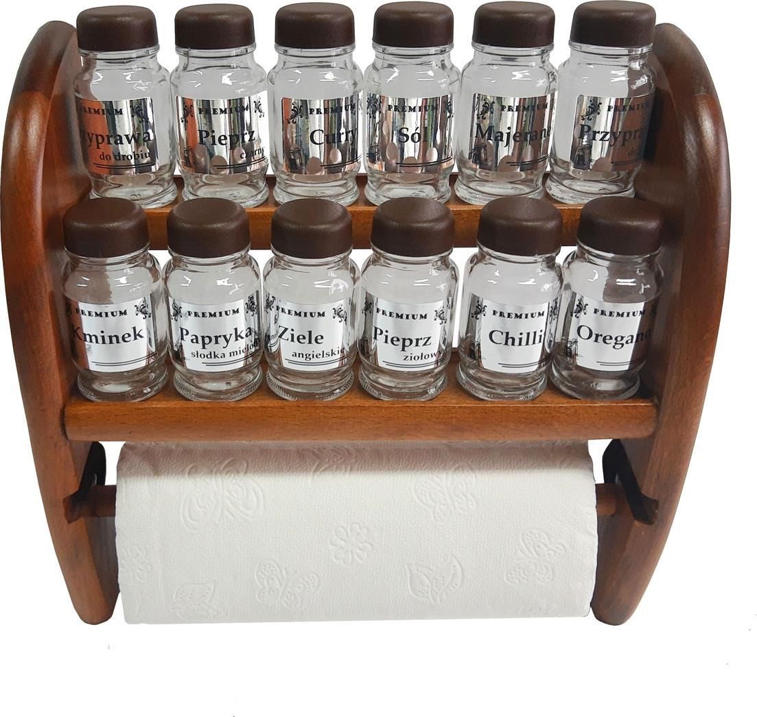 PRZYPRAWNIK STOJAK NA PRZYPRAWY 12 SŁOIKÓW + RĘCZNIK kod: 047591 marki: Krystynka W ZESTAWIE 12 SŁOICZKÓW WYPEŁNIONYCH PRZYPRAWAMI! Opis produktu: Funkcjonalna i wygodna półka na przyprawy z uchwytem na ręcznik papierowy, idealnie sprawdzi się w każdej kuchni Wykonana z wysokiej jakości, solidnego drewna jest stabilna i wytrzymała Można ją zarówno postawić jak i powiesić na ścianie W zestawie 12 słoiczków na przyprawy z grubego szkła, wypełnionych aromatycznymi ziołami i przyprawami Każdy słoiczek opatrzony jest etykietą z nazwą przyprawy oraz zabezpieczony nakrętką w kolorze brązowym W zestawie przyprawy: sól pieprz czarny papryka słodka majeranek kminek przyprawa do drobiu curry przyprawa do grilla ziele angielskie pieprz ziołowy oregano chilli Parametry: Materiał: drewno, szkło, plastik Kolor: ciemny brąz Kolor nakrętek: ciemny brąz Wymiary: głębokość półki: 11 cm zewnętrzna szerokość półki: 30 cm wewnętrzna szerokość półki: 26 cm wysokość półki: 29 cm wysokość słoiczka, przyprawnika: 8,5 cm waga zestawu: ok 2877 g