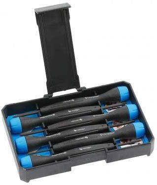 Charakterystyka: wykonane z wysokogatunkowej stali stopowej chromowo-wanadowej; trwałe, odporne na odkształcenia i uszkodzenia; magnetyczny grot zwiększający precyzję i wygodę pracy; rękojeść z obrotową nasadą gwarantuje szybką i wygodną pracę; dwukomponentowa, wyprofilowana rękojeść umożliwiająca wygodny chwyt i pracę wkrętakami. Zestaw zawiera: Wkrętaki precyzyjne płaskie: 0,5 x 3,0 x 25 mm, 0,4 x 2,5 x 25 mm, 0,4 x 2,0 x 25 mm, 0,3 x 1,6 x 25 mm Wkrętaki precyzyjne krzyżowe: PH0 x 3,0 x 25 mm, PH00 x 2,5 x 25 mm