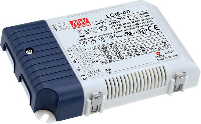 LCM-40 Zasilacz LED 40W 2~100V 0.35~1.05A Przemysłowe zasilacze, przetwornice i ładowarki Firma Mean Well Enterprises Co., Ltd. jest jednym z wiodących producentów urządzeń zasilających na świecie. Posiada ona 5500 standardowych modeli w ofercie oraz bazuje na ponad 35 letnim doświadczeniu w projektowaniu, tworzeniu oraz zaopatrywaniu klientów w urządzenia zasilające. Firma Mean Well oferuje klientom kompleksowe oraz niezawodne rozwiązania do bardzo szerokiej gamy zastosowań. SHEMECK jest autoryzowanym subdystrybutorem produktów Mean Well w Polsce. Ze względu na pojawiające się wątpliwości w zakresie zasilaczy Mean Well, informujemy, że firma Mean Well produkuje zasilacze wyłącznie pod swoim znakiem handlowym, bez powiązania z innymi znakami towarowymi. Zasilacze stałoprądowe z regulacją prądu i interfejsem DALI prąd wyjściowy ustawiany za pomocą przełącznika napięcie zasilania: 180-295VAC (180-277VAC LCM-25/25DA) w pełni izolowana plastikowa obudowa zabezpieczenie przeciwzwarciowe, termiczne (nadnapięciowe modele 40W i 60W) aktywny układ PFC izolacja klasy II temperatura pracy -30~+60°C IP20 dodatkowe wyjście pomocnicze 12V 50mA (modele 40W i 60W) funkcja kompensacji temperatury zewnętrznym NTC konsumcja mocy w stanie bez obciążenia funkcja synchronizacji do 10 jednostek funkcja ściemniania 0~10VDC i PWM (LCM-25/40/60) wbudowany interfejs DALI LCM-25DA/40DA/60DA) komunikacja Bluetooth LCM-25BLE/40BLE/60BLE zgodność z szeregiem norm i certyfikatów chłodzenie w otwartym obiegu powietrza 3 lata gwarancji zasilacz LED 40W 2~100V 0.35~1.05Ap> Dane techniczne: Model LCM-40 Wyjście 350mA, 2~100V ; 500mA, 2~80V ; 600mA, 2~67V ; 700mA, 2~57V (fab) ; 900mA, 2~45V ; 1050mA, 2~40V Tolerancja +/-5% Zakłócenia 700mV Wydajność 90.5% Wymiary 123.5x81.5x23mm