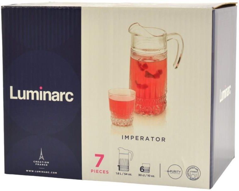 Komplet do napojów Imperator składa się z 7-elementów, wykonany ze szkła sodowego. Będzie świetnym rozwiązaniem na upalne dni i nie tylko, na każdego rodzaju przyjęcia. Komplet przeznaczony do zimnych napojów. Seria Imperator dedykowana jest dla klientów poszukujących w produktach zarówno funkcjonalności, uniwersalności, jak i odrobiny świeżości. Luminarc proponuje tutaj klasyczne linie zastawy stołowej, kieliszków i szklanek. Są to produkty bardzo dobrej jakości, spełniające szereg funkcji użytkowych, a przy tym i dekoracyjnych. Komplet składa się z: 1x dzbanek 1,6 l 6x szklanka wysoka 300 ml