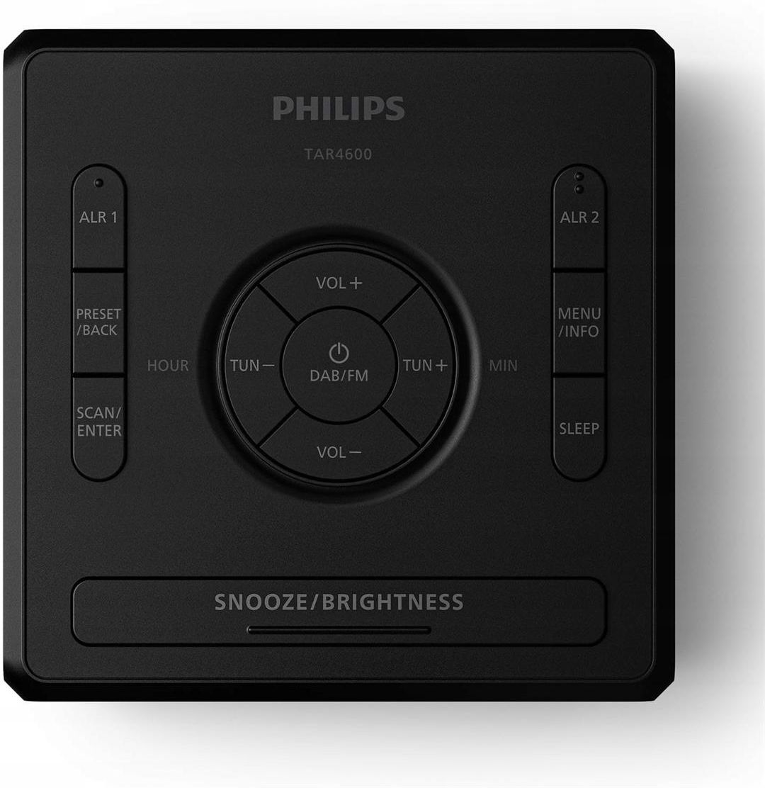 Opis produktu Philips TAR4600/10 to wielofunkcyjny radiobudzik łączący nowoczesny design z wygodą codziennego użytkowania. Wyposażony jest w cyfrowy tuner DAB+/FM, co pozwala na odbiór szerokiego zakresu stacji radiowych z wysoką jakością dźwięku. Urządzenie posiada wyraźny, regulowany wyświetlacz LCD, który ułatwia odczytanie godziny oraz innych informacji. Oferuje dwa niezależne alarmy z możliwością ustawienia budzenia sygnałem dźwiękowym lub ulubioną stacją radiową. Funkcja stopniowego zwiększania głośności ułatwia łagodne wstawanie. Dzięki portowi ładowania USB-C możliwe jest wygodne ładowanie smartfona bezpośrednio z budzika. Regulacja ustawień audio i zegara odbywa się za pomocą intuicyjnych przycisków. Radiobudzik oferuje także funkcję minutnika, który pozwala na zasypianie z muzyką i automatyczne wyłączenie radia po ustalonym czasie. W razie awarii zasilania czas i ustawienia alarmów są zabezpieczone przez dwie baterie AAA (brak w zestawie). Najważniejsze cechy Cyfrowy tuner DAB+ / FM z możliwością zapisu do 20 stacji Duży, czytelny wyświetlacz LCD z regulacją jasności Podwójny alarm z wyborem dźwięku lub stacji radiowej Funkcja minutnika do automatycznego wyłączania radia Port ładowania USB-C Łatwa obsługa przejrzystymi przyciskami Bateria zapasowa podtrzymująca pracę zegara i alarmów (2x AAA, brak w zestawie) Wymiary produktu: 10,3 x 10,3 x 3,81 cm Waga (bez opakowania): ok. 338 g Zasilanie sieciowe Zawartość opakowania Radiobudzik Philips TAR4600/10 Podręcznik użytkownika Informacje dodatkowe Kolor: czarny Materiał: tworzywo sztuczne Producent: TP Vision Model: TAR4600/10