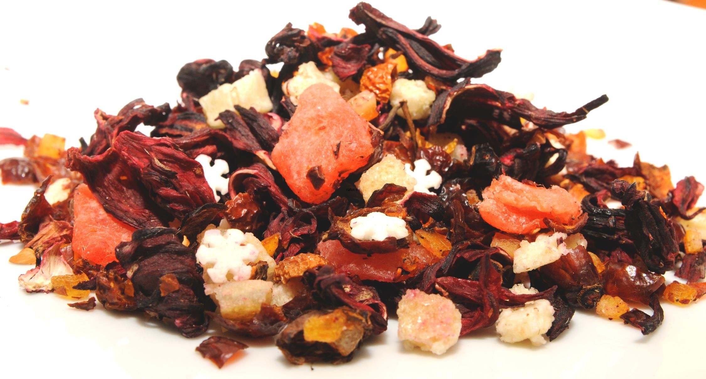 Skład: hibiskus, śnieżynki cukrowe, kandyzowana cytryna, kandyzowany melon,skórka pomarańcza, skórka róży,aromat.