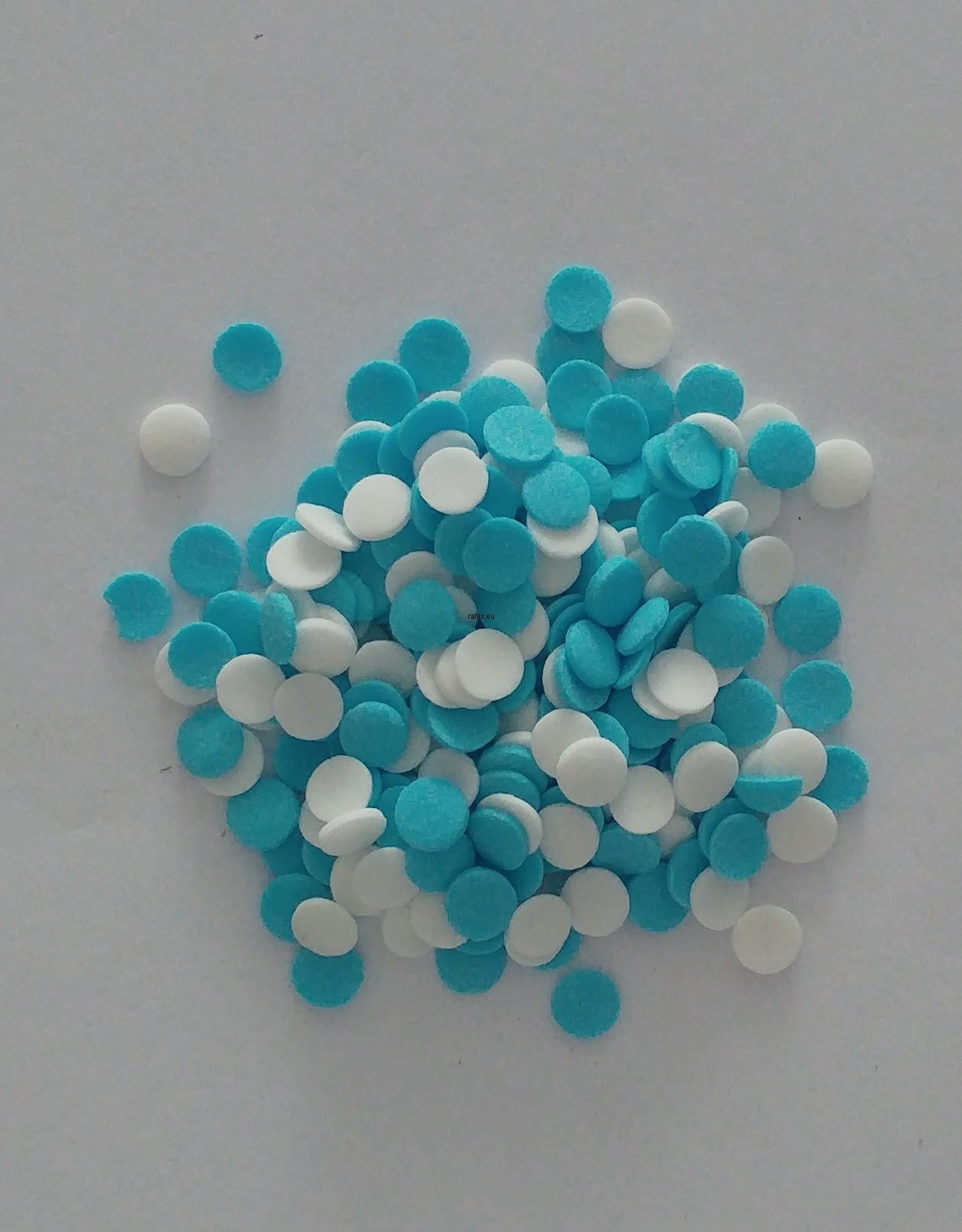Konfetti w kolorze biało-niebieskim to klasyczna dekoracja ciast, ciasteczek czy babeczek. Świetnie sprawdzi się podczas świąt w ozdabianiu pierników. Nieodłączny element tortów. Idealnie komponuje się z lodami o bitą śmietaną. Podstawa deserów i wypieków, bez której wielu nie wyobraża sobie słodkości. Dostępna także w opakowaniu o pojemności 1 kg.