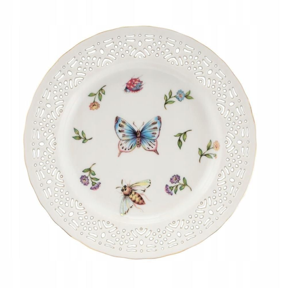 Talerz deserowy Villa Italia Leda Ivory 19 cm ażur Talerz deserowy ażurowy 19 cm Leda Ivory - Villa Italia Niezwykle elegancki talerzyk LEDA IVORY w nowym, pięknym odcieniu kości słoniowej. Ten przepiękny talerzyk o niepowtarzalnym kształcie i klasycznym fasonie ozdobiona jest ślicznymi ogrodowymi motywami (motylki, ważki, kwiatuszki, owady). Elementy tej kolekcji nie są identyczne - na części występują motyle (w różnych kolorach), na innych ważki - jest to efekt zamierzony, a nie wada. Szyku dodaje wysmukły kształt, podkreślony delikatnym tłoczeniem oraz misterną ażurową koronką wykonaną ręcznie. Lekkości i uroku dodaje kolekcji ręcznie malowana złota linia na obrzeżach stopek filiżanek i kubeczków. Leda Ivory to znany fason Villa Italia w nowej odsłonie kolorystycznej. Dawny, zdecydowany kremowy odcień został zastąpiony nowym, jaśniejszym odcieniem śmietankowej bieli. Talerzyk i pozostałe elementy kolekcji Leda Ivory sprawią, że każde spotkanie będzie miało niepowtarzalny charakter. Parametry średnica: 19 cm kolor: mlecznobiały Zestaw specjalnie pakowany i ubezpieczony do pełnej wartości Villa Italia to marka wysokiej jakości porcelany stołowej, szkła, sztućców oraz innych dodatków. Porcelna projektowana jest Mediolanie, a kolekcje tworzą serwisy obiadowe i herbaciane, które wyróżnia niespotykana biel, wyjątkowo gładkie szkliwo oraz piękne wzornictwo. Jakość całości podnosi ręczne zdobienie. Produkty Villa Italia kierowane są do klientów o niebanalnym guście, ceniących sobie jakość, walory estetyczne, jak również praktyczność.